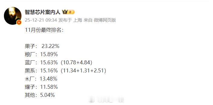 11月份国内排名出炉,小米国产第一1、苹果无可争议的拿到11月份的冠军,因为iPhone 17系列太火了。且苹果的领先优势比较大;2、小米整体排名第二,国产排名第一。主要是小米17系列、REDMI K90系列以及双十一热卖导致的;3、vivo排名第三,OPPO排名第四,华为第五,荣耀第六。PS:国产前三之间的差距是可以忽略不计的。央视曝光旧手机回收猫腻