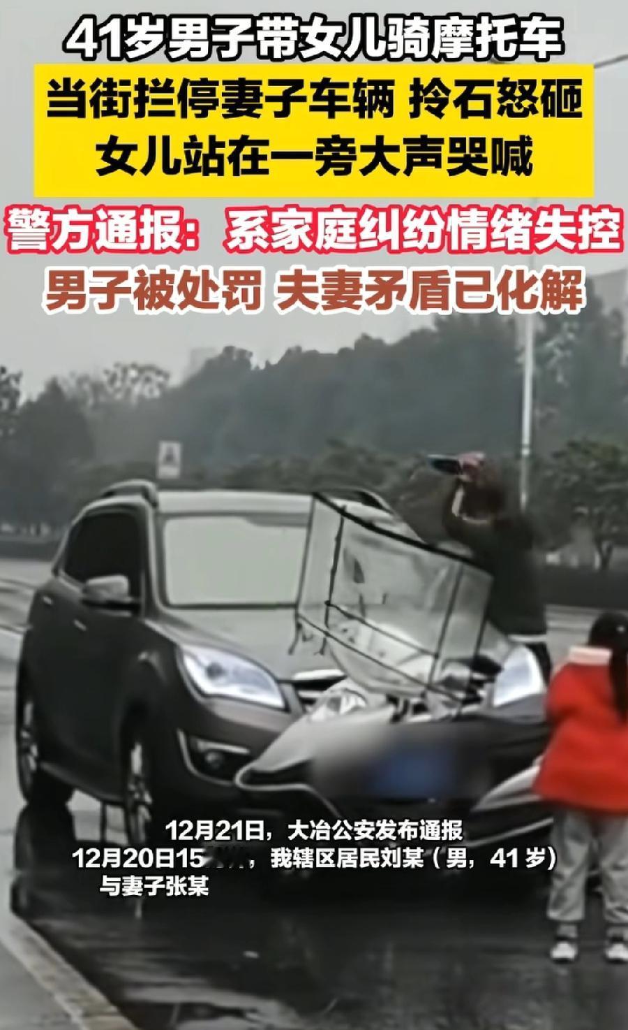 黄石男子街头砸前挡风玻璃,不是开车溅水,夫妻两口子吵架生气,砸自家的车!虽然家庭内部矛盾,违法了还是照样拘留,大马路上扰乱公共交通秩序,多危险!不知道二人为什么生气,让男子如此暴怒,情绪控制太差了,太容易失控了,就这脾气,老婆早没离婚就不错了,不过老婆也好不到哪去,女儿站大马路上那么危险都不管,俩人41岁、35岁,脾气像小孩一样,闹这么一出,所有夫妻的坏榜样!