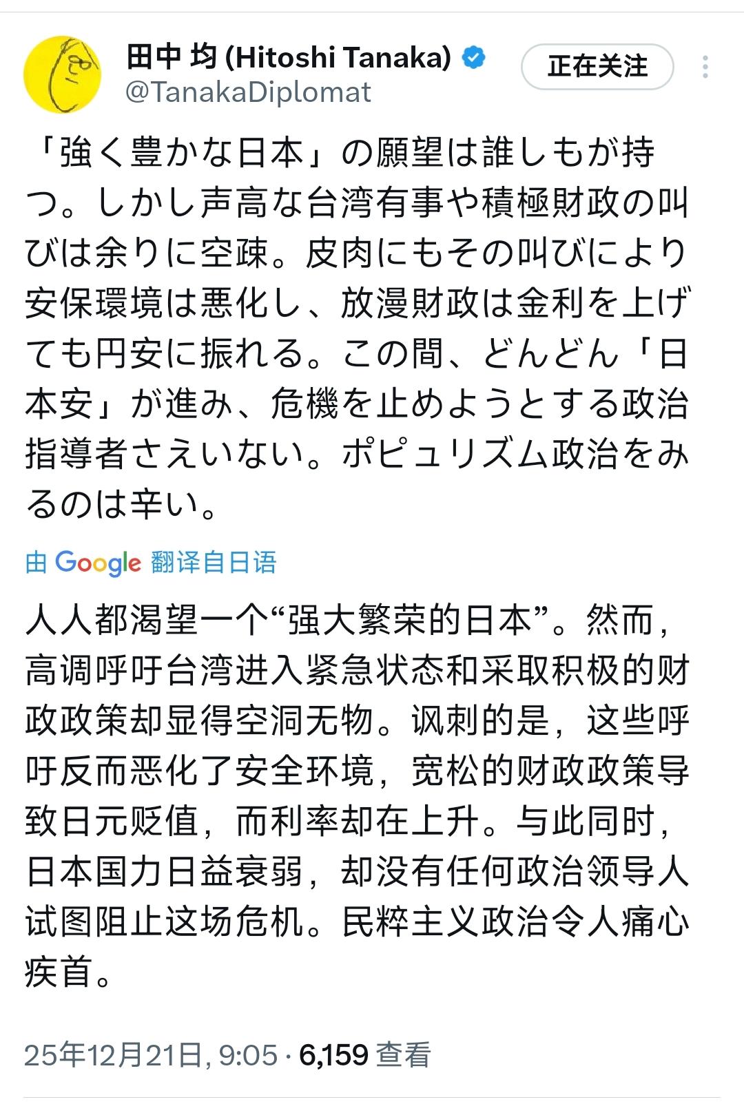 日本外交界的“元老”居然对自家政府开炮,直言日本国力日益衰弱! 就在12月14日,日本前外务副大臣田中均发文,直指高市当局搞的所谓“强大繁荣的日本”政策,批评高市发表错误涉台言论,说其“空洞无物”,反而还导致恶化安全环境、日元贬值、而利率却在上升。 面对此种情况,“却没有任何政治领导人试图阻止这场危机。民粹主义政治令人痛心疾首。” 有一说一,田中均的批评其实非常中肯,其所想表达的实质说穿了就是——日本就是在没有实力的情况下挥舞拳头。 之所以这么说,是因为无论是高市搞的政策,还是他的反华立场,都没有给日本带来任何好处。说话穿了就是,高市嘴巴上叫的响,非常迎合民粹,除了有支持率外,什么都没有。 就比如说,高市不是在解决日本自己的社会问题,不顾经济萎靡,也要提前实现"防卫费占GDP2%"的目标;也不在台湾问题上惹怒中国会遭到何种层面的反制,也要宣称日本要武力介入台海局势。 说难听点就是,高市并没有在实质层面解决任何一个日本所要面对的问题,相反,她为了实现让日本突破和平宪法、扩军、发展攻击性武器、乃至对“无核三原则”下手的野心,甚至还在恶化日本的问题。 但这还没完,真正的问题在于,还没人能拦住她!所以田中均才要批评说“民粹主义政治令人痛心疾首”。 实事求是讲,日本摊上高市这一个首相也是倒了霉了,但倒霉还不要紧,要紧的是,日本人压根就不知道自己有多倒霉。