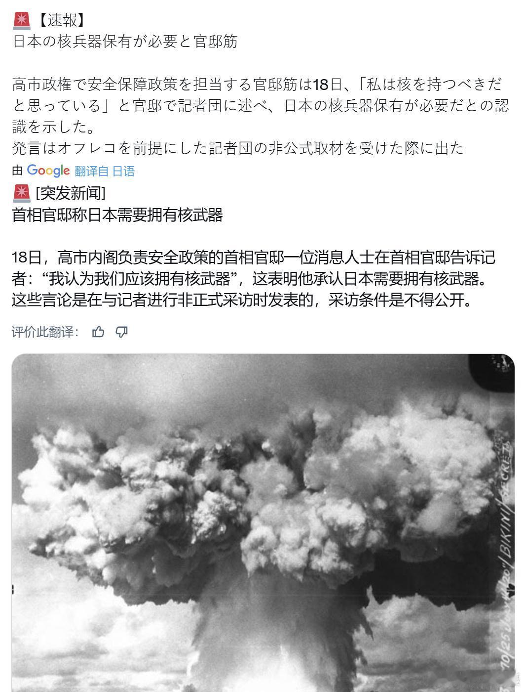 日前,一名来自日本首相府的官员在与记者的私下谈话中表示日本需要拥有核武。事件披露后,朝中社今(21)日刊登一篇朝鲜外务省日本研究所所长文章,对此坚决反对,强调日本企图拥有核武器的野心应该受到遏制,并指如果日本掌握核武器,“不仅亚洲国家将面临灾难,人类也将陷入前所未有的灾难”。 朝中社报道,文章指出,此番日本需要拥有核武的言论并非一时失言,而是直接摆明日本长期以来的拥核企图,挑战日本宪法以及作为二战战败国所应承担的国际法义务。 文章还批评日本假借俄乌冲突,以及炒作周边面临巨大威胁的议题,意图推动美国所承诺的《核保护伞》论,指明日本政界的真正目的在于企图合理化核武装行动,强调日本一边自持“世界唯一原子弹受害国”的旗帜,声称推动“世界无核化”,另一边却给予推动拥核议题,此种举动是两面派行径。而人类应该坚决阻止这种美国支持下,日本展现追求核武装的危险军事行为。
