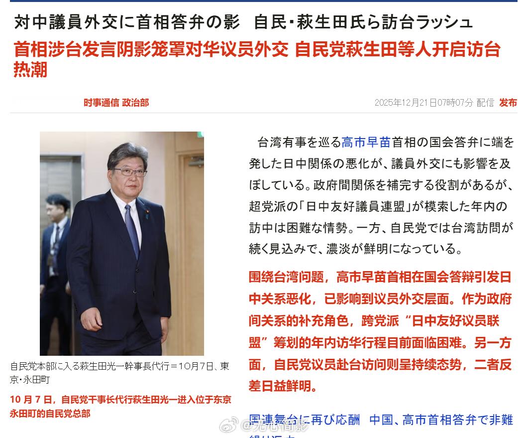 中日外交关系紧张之际,日本自民党代理干事长萩生田光一今天启程窜访中国台湾省。访问期间,将协调与赖缺德的会谈。台湾省断交部还宣布,日本前法务大臣铃木馨祐,以及曾在石破内阁担任首相辅佐官的众议院议员长岛昭久等人将窜访台湾。前外相河野太郎等麻生派的 6 人也计划从 24 日起窜访台湾省,据称,截至明年年初,窜访台湾省的日本国会议员将达到约 30 人。日本TBS评论称,此举“预计将引起中国的反对。”(这是火上浇油来了)海外新鲜事中日外交局势二战日本集中营女性遭遇曝光