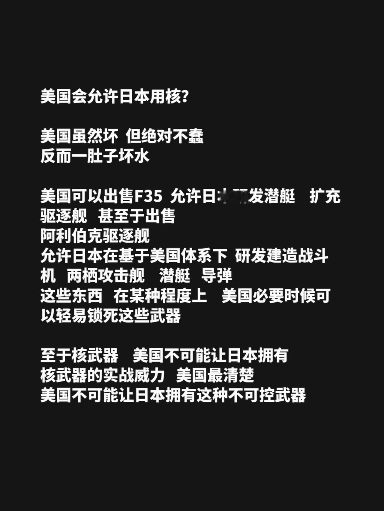 美国会允许日本用核?美国虽然坏 但绝对不蠢反而一肚子坏水美国可以出售F35 允许日本研发潜艇 扩充驱逐舰 甚至于出售阿利伯克驱逐舰允许日本在基于美国体系下 研发建造战斗机 两栖攻击舰 潜艇 导弹这些东西 在某种程度上 美国必要时候可以轻易锁死这些武器 至于核武器 美国不可能让日本拥有核武器的实战威力 美国最清楚美国不可能让日本拥有这种不可控武器