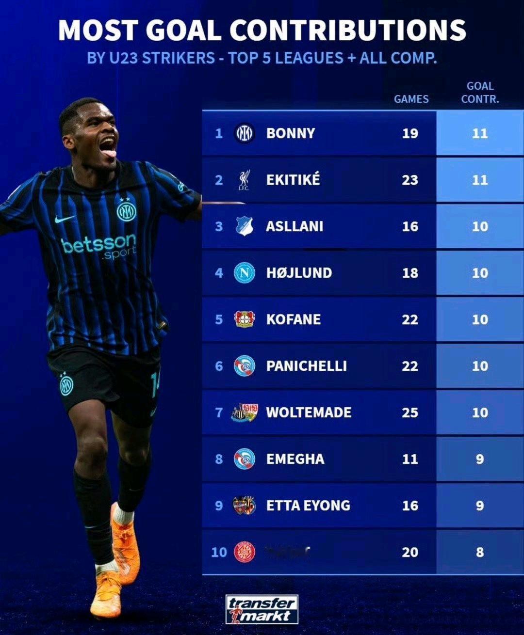 本赛季23岁以下球员参与进球数,国际米兰的博尼都没人挖吗? 他才19岁,跟法国同胞埃基蒂克表现差不多,但是埃基蒂克23岁卖到利物浦8000多万呢。 有人说博尼会是下一个埃托奥,这样的话国米未来锋线不愁了。[得意]