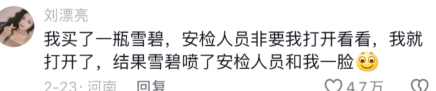 我买了一瓶雪碧,安检人员非要我打开看看,我就打开了,结果雪碧喷了安检人员和我一脸