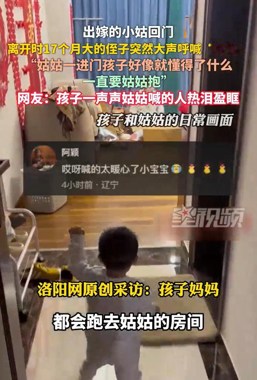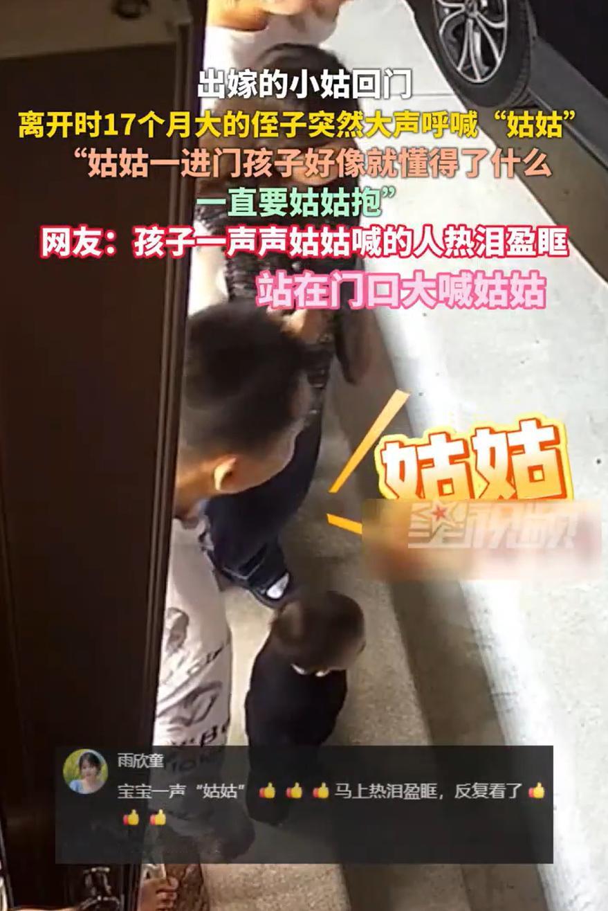 泪目了!广东汕头,女子出嫁后回门,正准备坐车离开时,17个月大的侄子却突然挣脱妈妈的怀抱,从屋里跑出来,用还不太利索的话大喊“姑姑”,就连孩子的妈妈都对孩子举动很意外 视频中,孩子脸涨得通红,小手使劲挥着,像是用尽了全身力气想要留住姑姑。一旁的妈妈本来想拉住他,却被这突如其来的举动弄得有些意外,眼圈也跟着红了。姑姑本来已经半只脚跨进车里,听见声音回头,看见那个小小的身影朝自己奔来,立刻转身蹲下,一把将侄子搂进怀里,轻轻拍着他的背,嘴里低声安慰:姑姑过段时间就回来,很快就回来看你 后来孩子的妈妈讲,姑姑没出嫁前,和孩子感情就特别深。孩子平时睡觉前、睡醒后,第一件事就是跑去姑姑房间。那天姑姑回门,小家伙好像什么都懂似的,一直缠着要姑姑抱。直到姑姑临走,他听见车响,才急了,挣脱着跑出来。姑姑听见那一声“姑姑”,也终于没忍住,抱着孩子一起掉眼泪 很多人看了视频,留言说破防了,也有不少人感叹,说在所有亲戚里,姑姑往往是最亲的。这话听起来有点绝对,但仔细想想,好像身边不少人的记忆里,确实有个特别疼自己的姑姑 为什么姑姑这个身份,总带着一种天然的亲近感? 也许因为姑姑是爸爸的姐妹,身上流着和父亲相似的血,却比父亲更多一份温柔与细腻。她是从这个家走出去的,最懂这个家的气息,也最记得怎么疼这个家里的下一代。她不像父母那样有管教的责任,也不像远亲那样有距离,她就是一个可以陪你闹、听你讲、偷偷给你塞零花钱的人 这种感情,往往没什么道理,就是日常里一点一滴积累起来的。是每次回来都记得的零食,是睡前讲的故事,是受了委屈时可以投奔的怀抱。孩子最敏感,谁真心对他好,他就黏着谁。那一声脱口而出的“姑姑”,其实就是依赖与爱最本能的表达