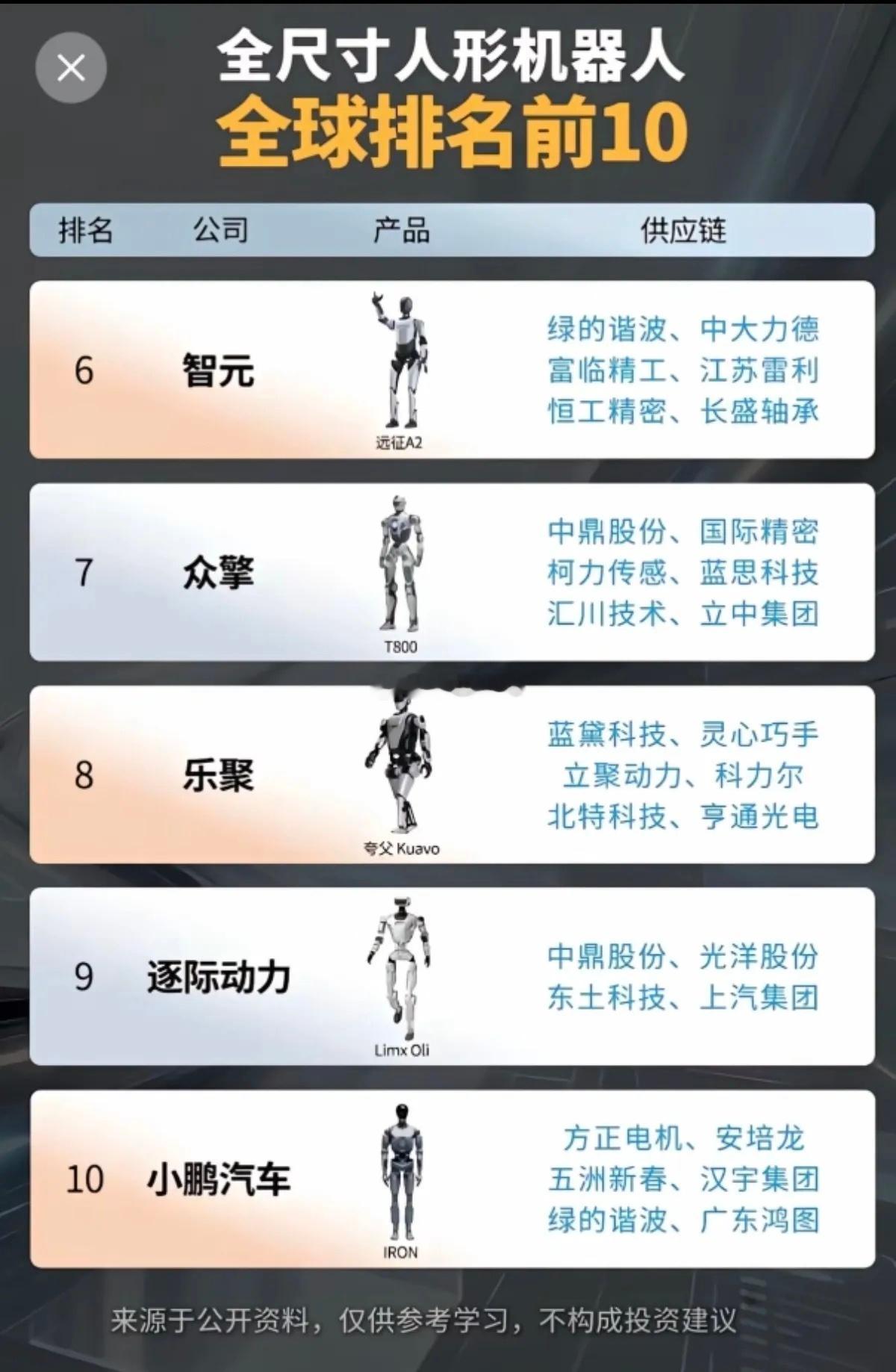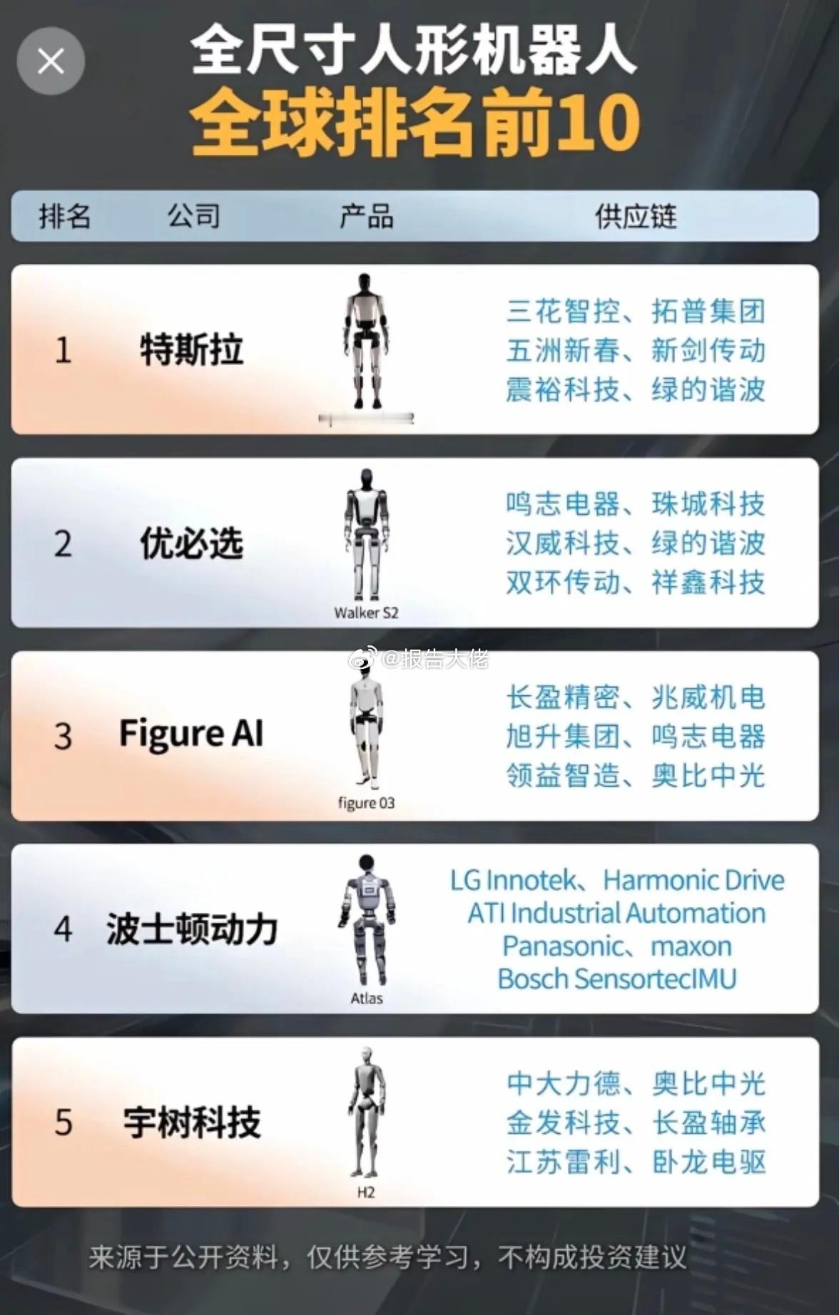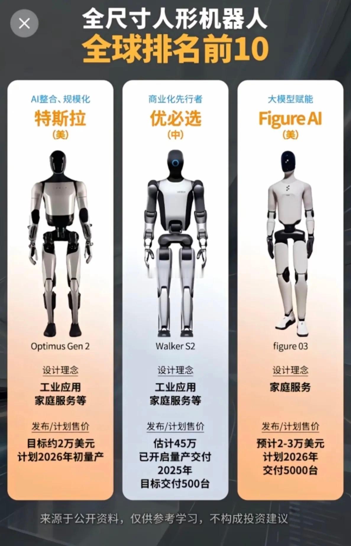 全尺寸人形机器人:全球排名TOP101.特斯拉,2.优必选3. Figure AI4.波士顿动力 5.宇树科技 6.智元 7.众擎8.乐聚 9逐际动力 10小鹏汽车大家对未来,最看好哪一款?!