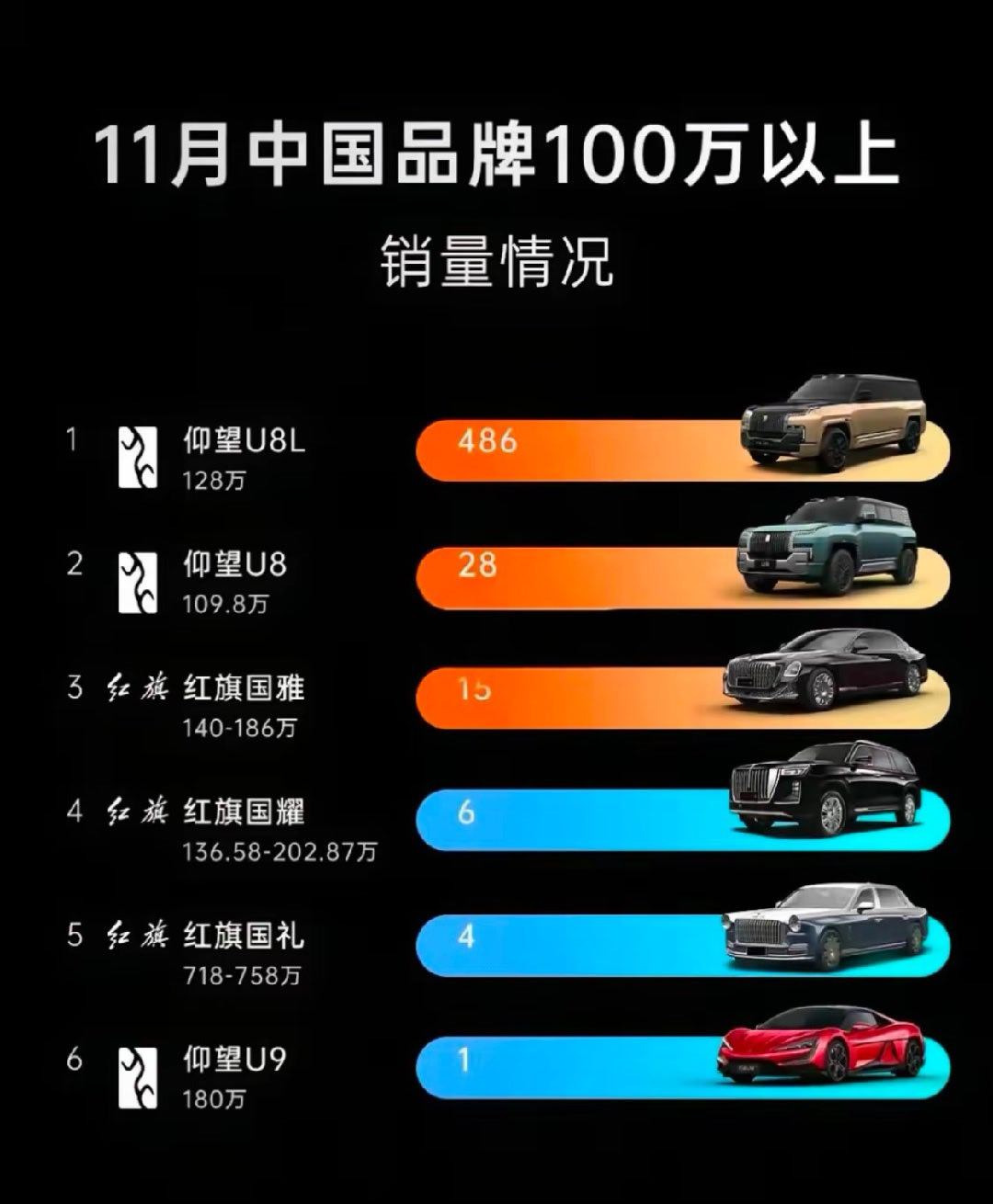 11月中国品牌100万以上车型销量排行,仰望U8L第一,U8第二
