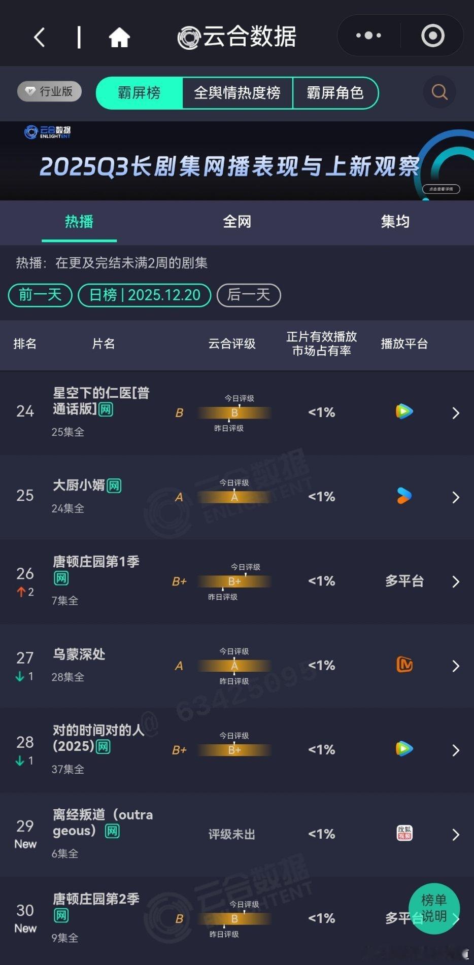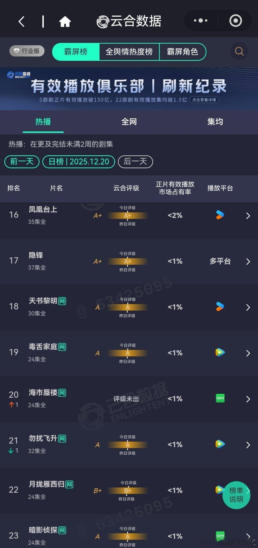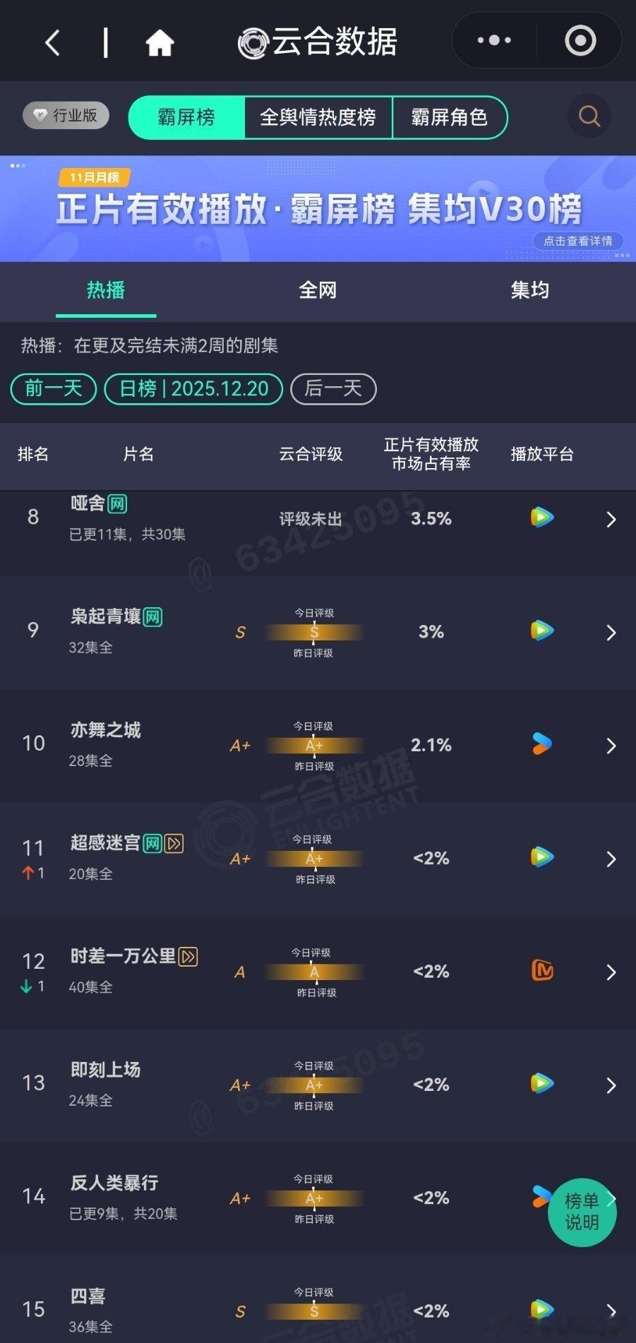 12月20日云合播放占比云合 老舅23.3%万万没想到,年末最靓的仔会是老舅。长安二十四计14.3%评级上升到S+了,要起飞了,喜大普奔啊。双轨10.4%救不回来了。