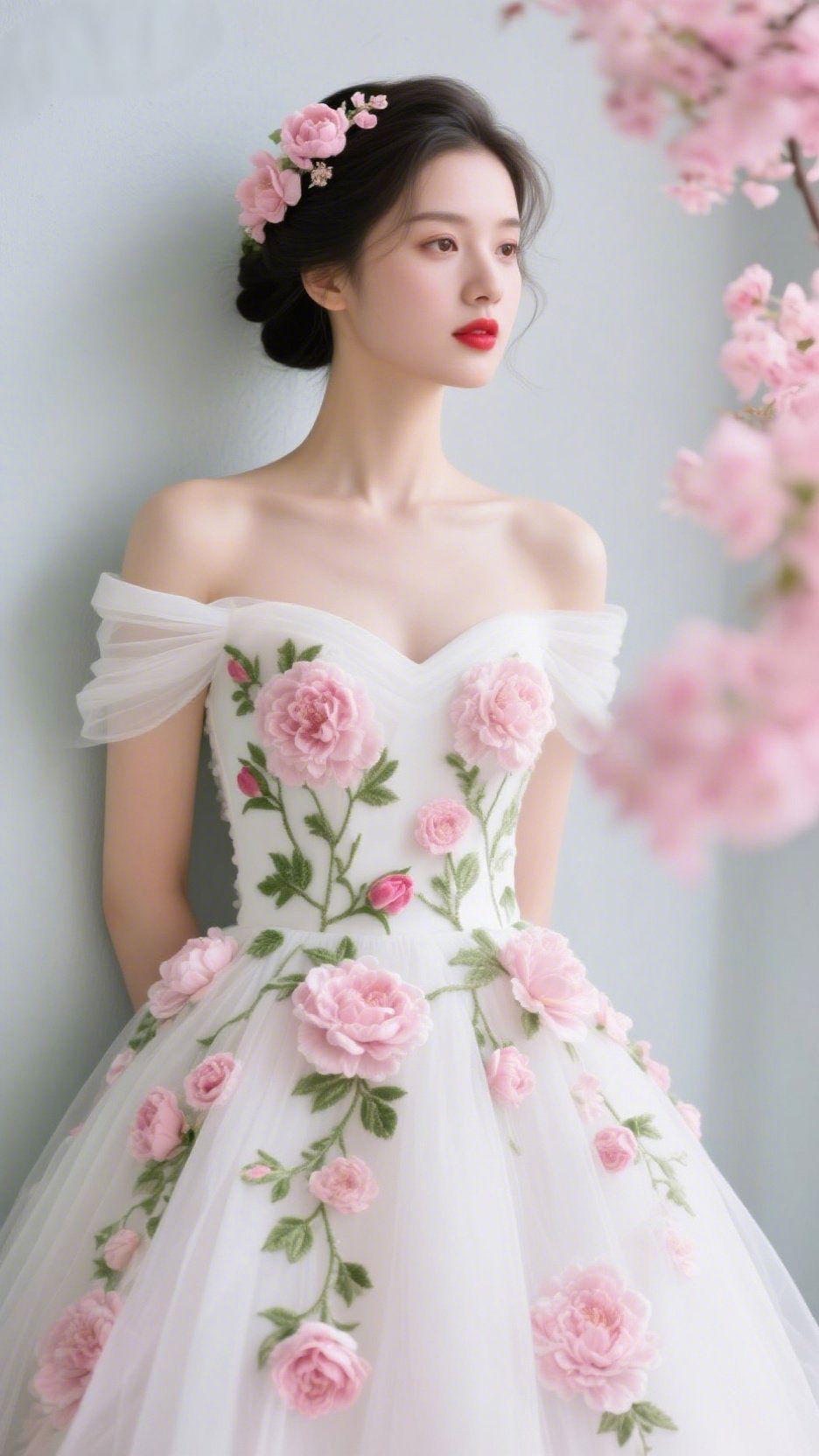 裙间春色裹柔香 淡墙晕着浅雾般的白,她静立其中,发间粉花先衔了春的软。 裙肩叠着云的轻褶,纱袖垂如薄雾,绣在裙身的粉玫像刚从枝间拢来——瓣边沾着软光,茎蔓缠过纱裙,连叶尖都浸着浅香。唇上的红是春梢轻绽的艳,鬓边碎发缠着凉风,侧脸落进柔光里时,连空气都漫着软意。 旁侧花枝探过身,瓣影叠在裙纱上,像春把整季的柔都织进了这一幕。原来最动人的从不是花与纱,是有人站成了春的模样,抬眼时,便成了旁人眼里的花期绵长。 春日美学 温柔穿搭