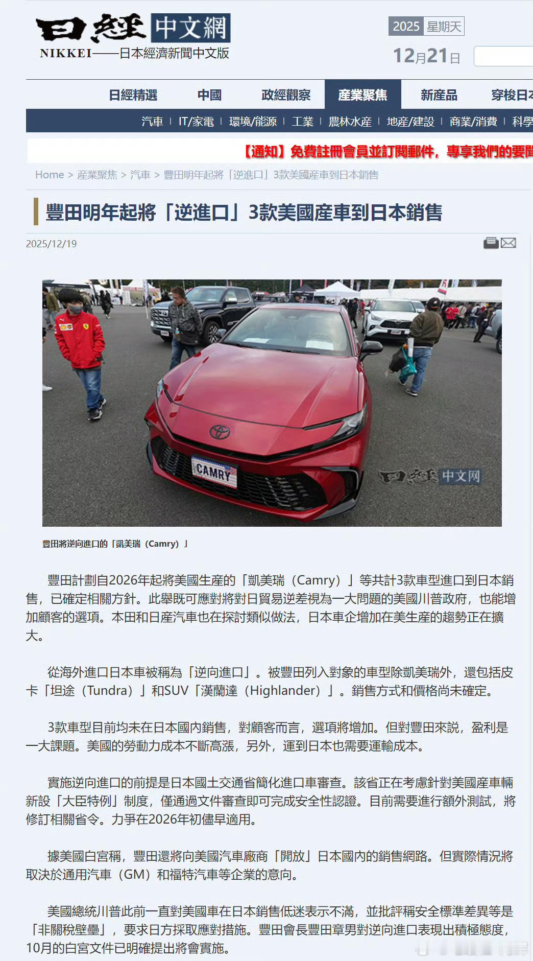 迎合特朗普政府,日本丰田将会从美国“反向进口”凯美瑞、汉兰达以及坦途三款车回到日本进行销售,日本民众也是买上美国进口车了
