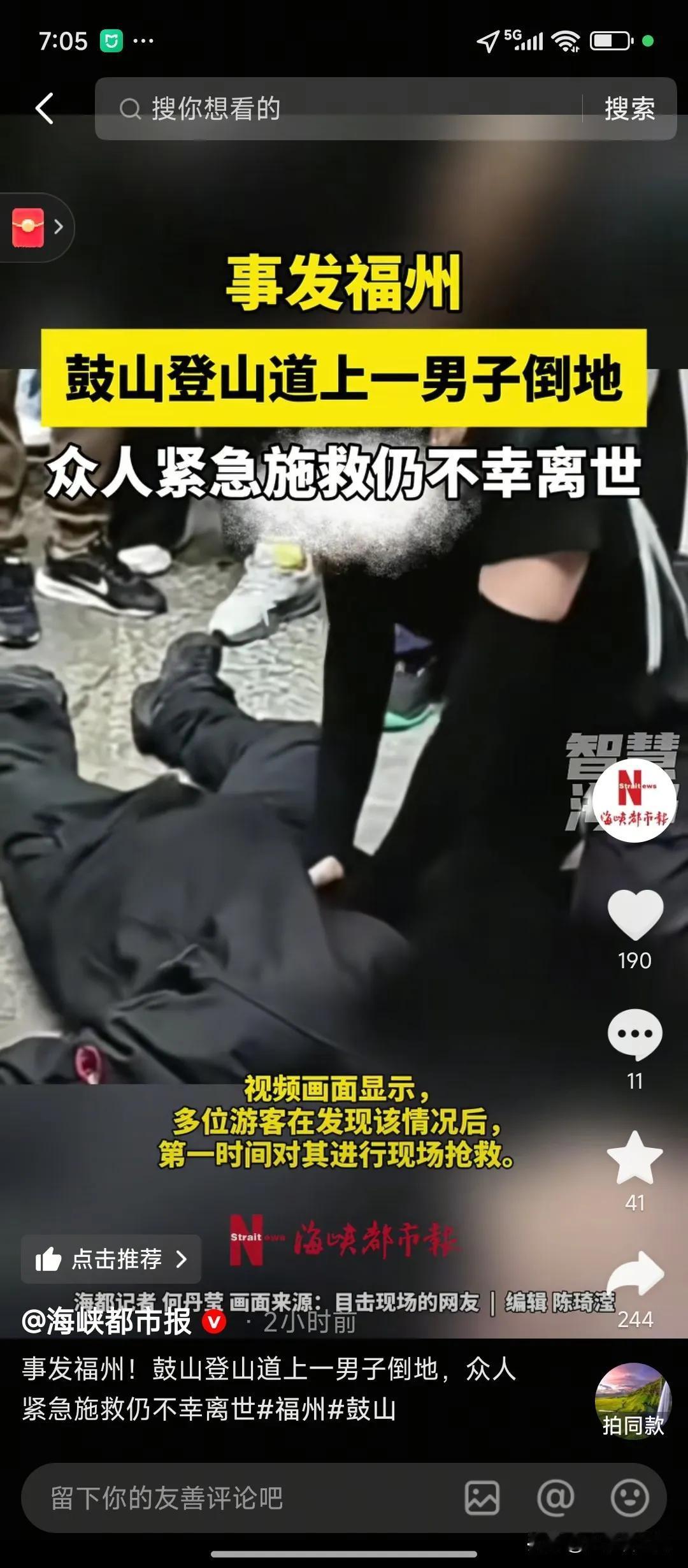 明天和意外你永远不知道哪个先来!今天12月20日星期六,一名五十岁左右身体强壮的男子,倒在福州icon鼓山风景区的古道上,距半山亭几步之遥。 周围游客立刻出手相救,打120,119的都有,做心肺复苏等,但回天乏力,该男子最终身亡。 网友表示:我今年75岁,上个月也去偿试了一次爬鼓山的滋味,因我有冠心病,走不了多长路程就开始气喘吁吁,途中经过4次休息,共花了一个半小时,终于成功登顶,这也许是最后一次了。 心脏不好的不要去做这种高负荷的运动。 人有千万种体质和原生性疾病,不要随口评论讥讽他人!人生无常,阎王叫你三更去,绝不可能到四更。虽然常说人生三万天,可实际上又有多少人到不了三万天!人生活的精彩不仅看长度,更要看深度和宽度,个人认为质量第一。突然逝去,没有病魔长期缠身,未尝不是一件好事! 福建的朋友:去年和朋友信誓旦旦要登上去乘缆车下来,还没到一亭就觉的气喘不上来,急忙招呼朋友下来干脆买了缆车双程票,只登了观景亭至涌泉寺山门的一段较平坦的路程。岁月不饶人,前年我还单独登过三次松涛路,没有感觉不适,去年就出现了难受的状况。今年我更是一次都未光顾鼓山。 现在和以前不一样了,以前五十岁就觉得自己是老人辈了,会量力而行,实际上身体体力都还很好,现在的人五十岁了确觉得自己很年轻,仿佛二十几岁的光景就在昨天,不知道自己早已经被生活的压力,酒肉美食掏空了身体,劝解7080后的这一批人要真的注意身体健康了。 一般正常人不会因为登山就心脏骤停,能心脏骤停一定是心脏之前就出现问题了,这两年心脏问题会是很多人的问题,国外日本这几年猝死的也不少。