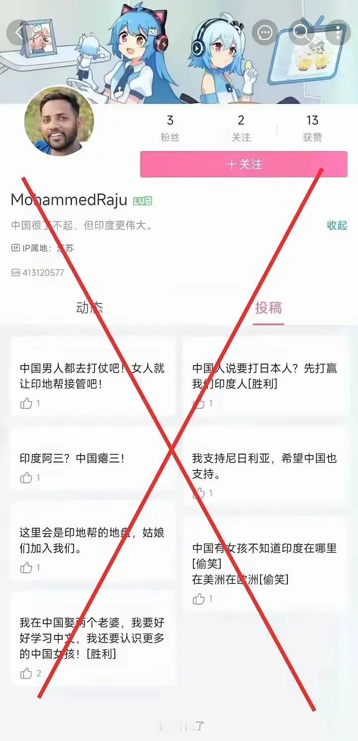 江苏有个印度IP的货,在B站上跳着脚骂咱中国“瘪三”,干的缺德事简直突破底线! 这货先拿中国女性开刀,叫嚣“娶了两个中国老婆,还要更多女孩加入印地帮”,合着把咱姑娘当战利品?更离谱的是他极端精日,狂言“中国先打败印度再吹打败日本”,这不是往咱民族感情上捅刀子吗? 最不能忍的是,他竟敢在戍边英烈的海报下骂脏话!陈红军、陈祥榕他们用命守边疆,轮得到他这洋垃圾侮辱?B站封他账号是活该!但这哪够?侮辱英烈、歧视女性、散布精日言论,这明摆着是刑事犯罪,三罪并罚都不为过! 咱中国人可不是好欺负的!封号只是开始,必须让他蹲大牢吃牢饭!判完刑直接驱逐出境,这辈子别想再踏进中国半步!别让他跑了,更别让他觉得骂完人能全身而退! 咱不搞网络暴力,但法律必须亮剑!不严惩不足以平民愤,对不起英雄们流的血!就等着看,这号货色跑得了和尚跑不了庙!