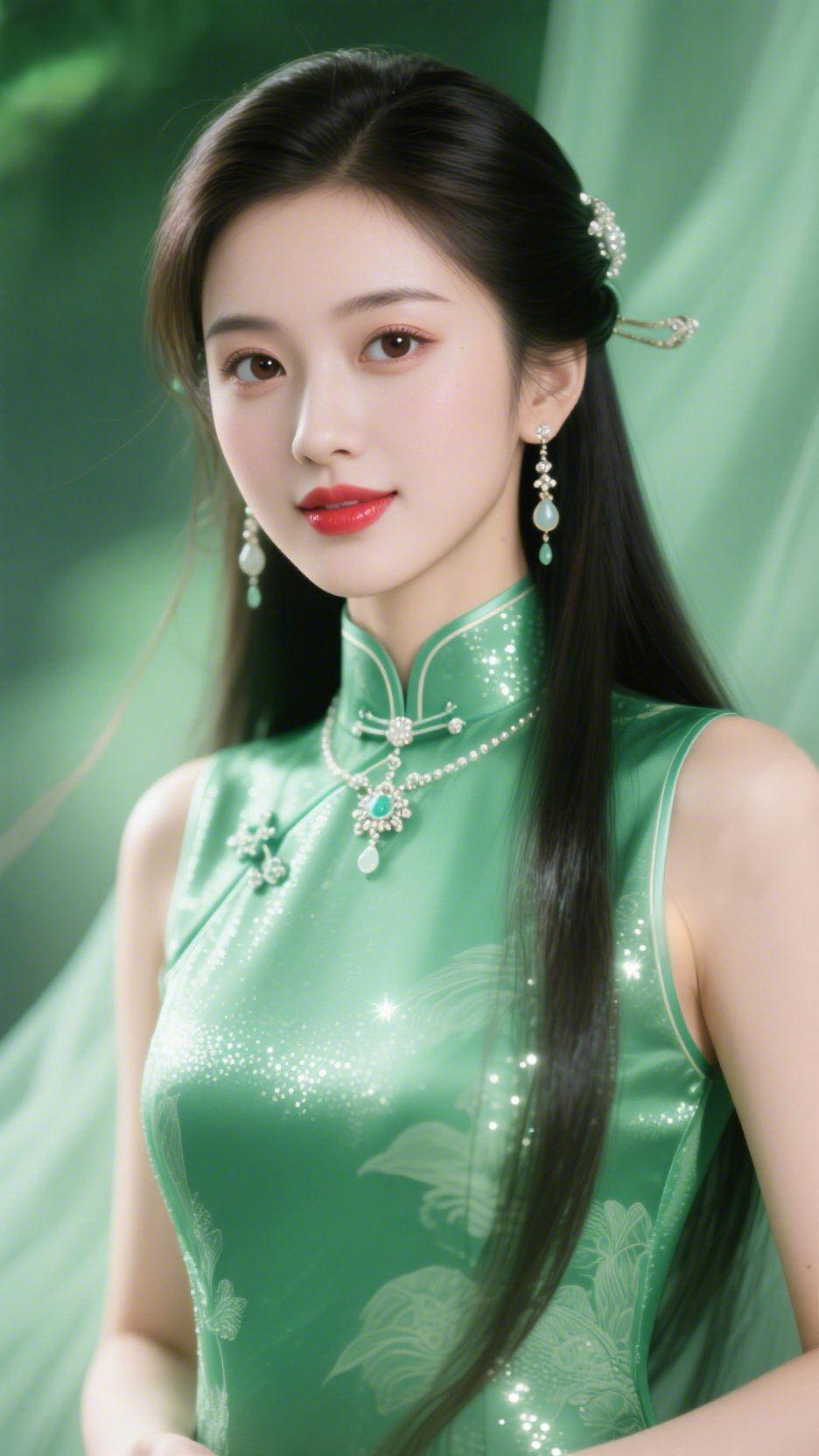 青衫裹春浸柔光 淡绿幕布晕着雾色,像把整缕春揉进了背景里。她立在光中,旗袍是新柳抽芽的青,缎面碎光如沾了晨露的叶,襟上暗纹叠着浅淡花意。 发间银饰坠着细闪,耳坠摇着玉色的软,颈间链饰衬得襟领愈发明净。唇色是春桃初绽的红,抬眸时,周遭风都裹了温软的韵。 原来国风之美从不是衣饰堆砌,是有人把春的清柔藏在襟袖间,站在那里,便成了旁人眼里漾开的江南意。 中式旗袍 春日氛围感