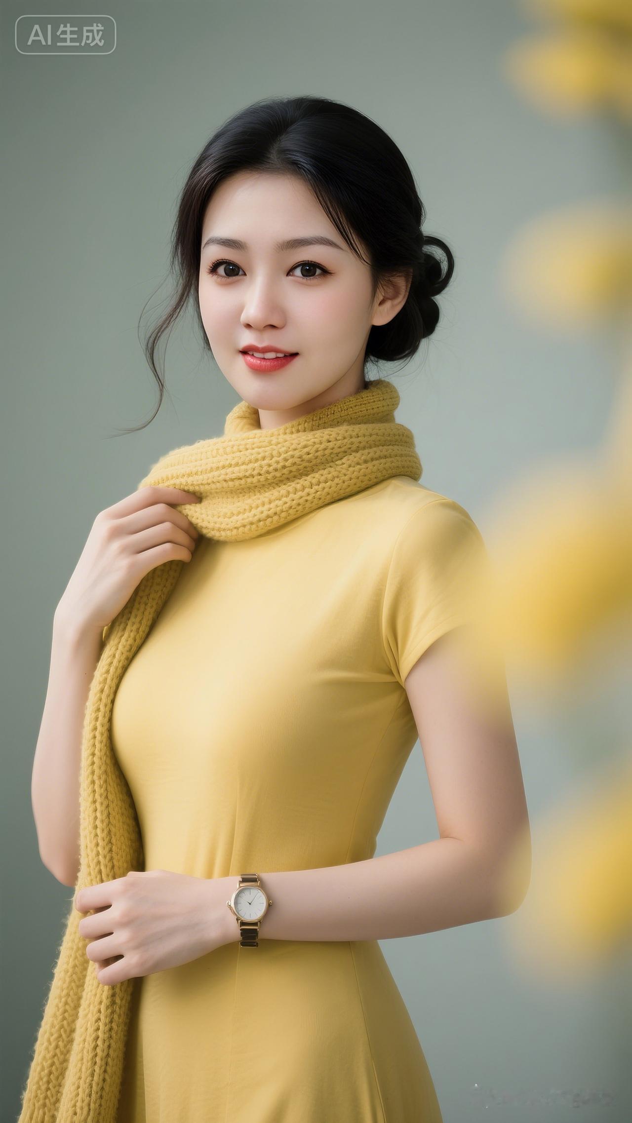 这位小姐姐穿着黄色连衣裙,围着黄色围巾,手戴手表,微笑看着镜头。