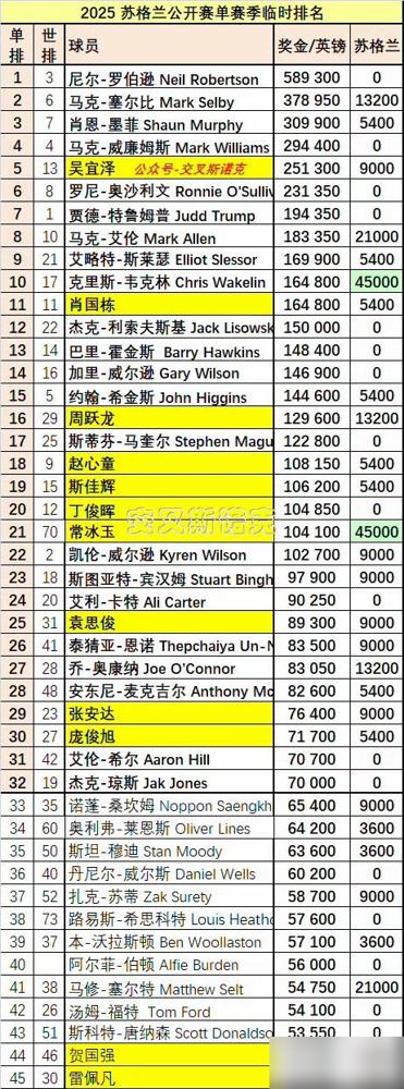 常冰玉如果能在苏格兰公开赛夺冠,差不多可以拿到所有斯诺克红包赛门票。 这次苏格兰赛他发挥得确实稳,一路过关斩将杀进决赛,现在只剩韦克林这一道关卡要闯,这一仗的表现将直接决定他接下来的赛程含金量。 说白了,职业选手拼冠军也是在拼“门票”,只要这场赢了,后面像冠中冠、世界大奖赛这种高额奖金赛,他基本就能稳稳入局。 但我看了一下排名形势,最纠结的点在于,如果常冰玉真的靠夺冠突围,原本在席位上的周跃龙就很可能被挤掉,这种“自家人”之间的排位竞争挺残酷的。 相比之下,对手韦克林就从容多了,他已经提前锁定了球员锦标赛的名额,心态上估计会更放松一些。 比较让人感叹的是,像斯佳辉、赵心童,甚至包括丁俊晖,目前看基本都已经无缘球员锦标赛了。 这种梯队顶端球员的集体缺席确实挺遗憾,也说明现在的积分排名争夺战已经到了白热化的地步,稍有不慎就会掉队。 斯诺克赛场就是这么现实,一个冠军不仅是荣誉,更是后续一连串顶级赛事的敲门砖。