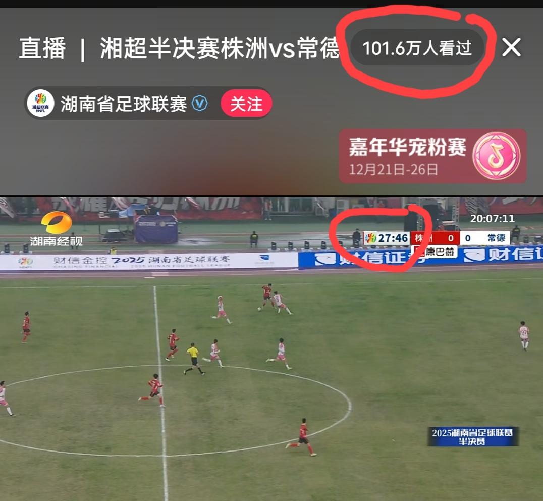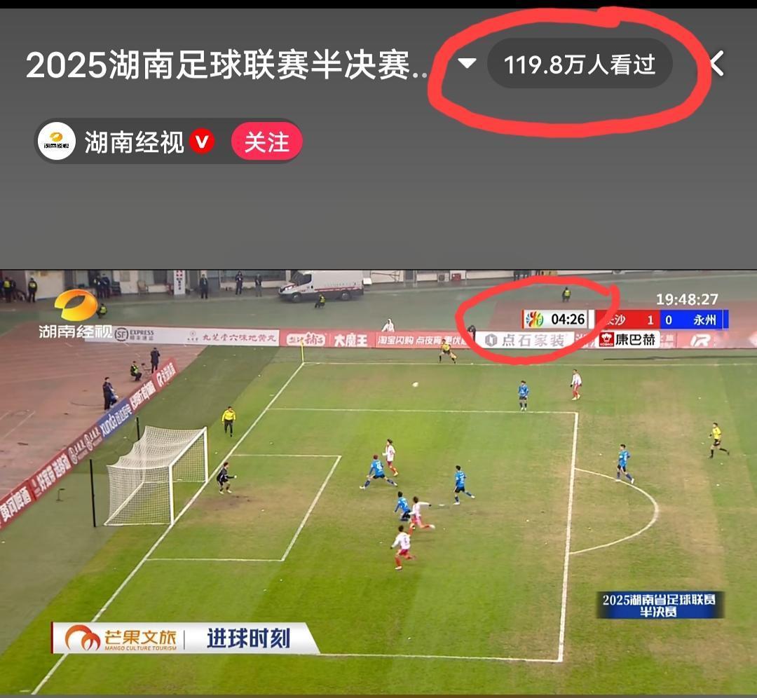 两场湘超半决赛在直播间观看人数的对比。 昨天长沙vs永州这场比赛,才打了四分钟,湖南经视直播间的观看人数已经119万多了。 而今天株洲vs常德的比赛,比赛进行到了28分钟,也是湖南经视,直播间的观看人数才刚刚超过100万。 如此看来,还是第一场的人气稍微高一点,毕竟一个是省会城市,一个是今年湘超的流量担当,两者之间的较量显然更有话题度,会有更多人的关注!