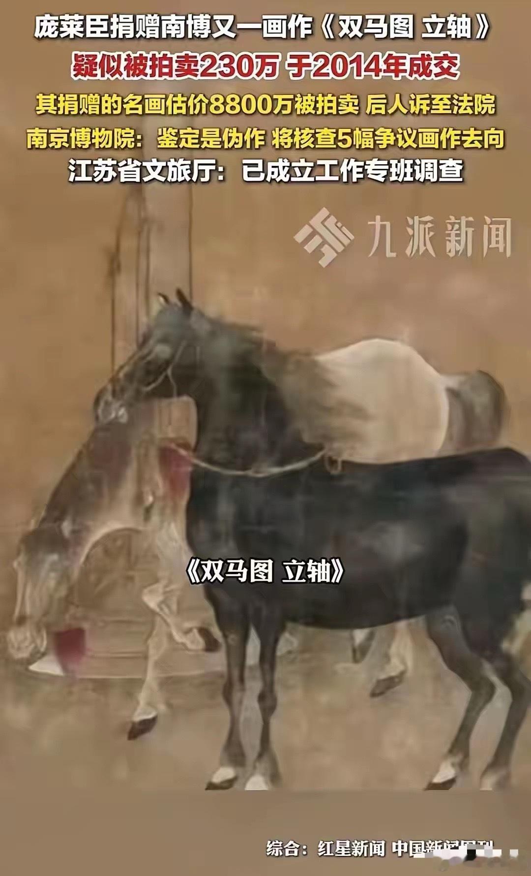 终于传来好消息!当年庞家捐给南京博物院另外四幅失踪的名画,其中的《双马图轴》已经有了下落,据悉是在2014年就已经被拍卖了,当时是230万成交的。如果要是想找到拍卖人也不难,肯定都有记录,但问题是怎么要回来?毕竟人家是通过正规的拍卖会得到的。如果按照当时的拍卖价格退回,拍卖人肯定是不同意,如果按照更高的价格退回,多出来的资金应该由谁来付啊?