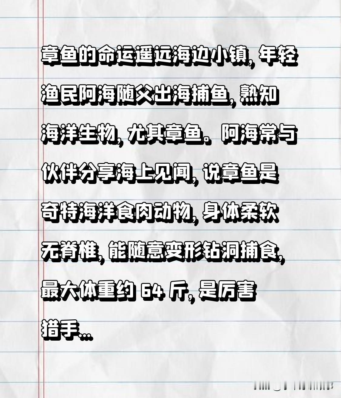 章鱼的命运 遥远海边小镇,年轻渔民阿海随父出海捕鱼,熟知海洋生物,尤其章鱼。 阿海常与伙伴分享海上见闻,说章鱼是奇特海洋食肉动物,身体柔软无脊椎,能随意变形钻洞捕食,最大体重约 64 斤,是厉害猎手。 一天傍晚,阿海和父亲出海,用系绳小瓶捕章鱼。他们把瓶子扔进海里,章鱼钻进瓶口被困。但有只大章鱼挣扎,阿海取它时被喷墨,瓶子落海。 回家后阿海思索,次日海边见螃蟹绕行。好友阿强说囚禁章鱼的是习惯和思维定式,人也会如此。 此后阿海尝试新捕鱼法,收获增多。那只章鱼或许也会改变命运。