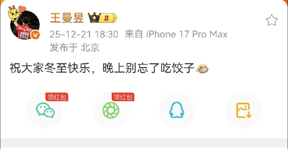 王曼昱在冬至当天给球迷们送祝福来了!这丫头估计今晚在家里正在吃酸菜猪肉馅的水饺呢?哈哈! 鳗鱼是真好,提醒球迷朋友们冬至要吃饺子,这不赶紧送祝福了来了,刚刚发Wb了!说道:祝大家冬至快乐,晚上别忘记吃饺子哦! 收到祝福了,曼昱,我今晚吃的韭菜鸡蛋馅水饺,哈哈!你吃的啥馅 我猜鳗鱼应该吃的酸菜猪肉馅,因为作为东方姑娘,冬天最喜欢吃这个馅了,我猜鳗鱼应该也喜欢吃吧 还能休息几天就要去南京参加乒超总决赛了,这次鲁能姐妹花又重逢了,期待总决赛上鳗鱼的精彩表现,我依旧很看好我的小老乡哦!