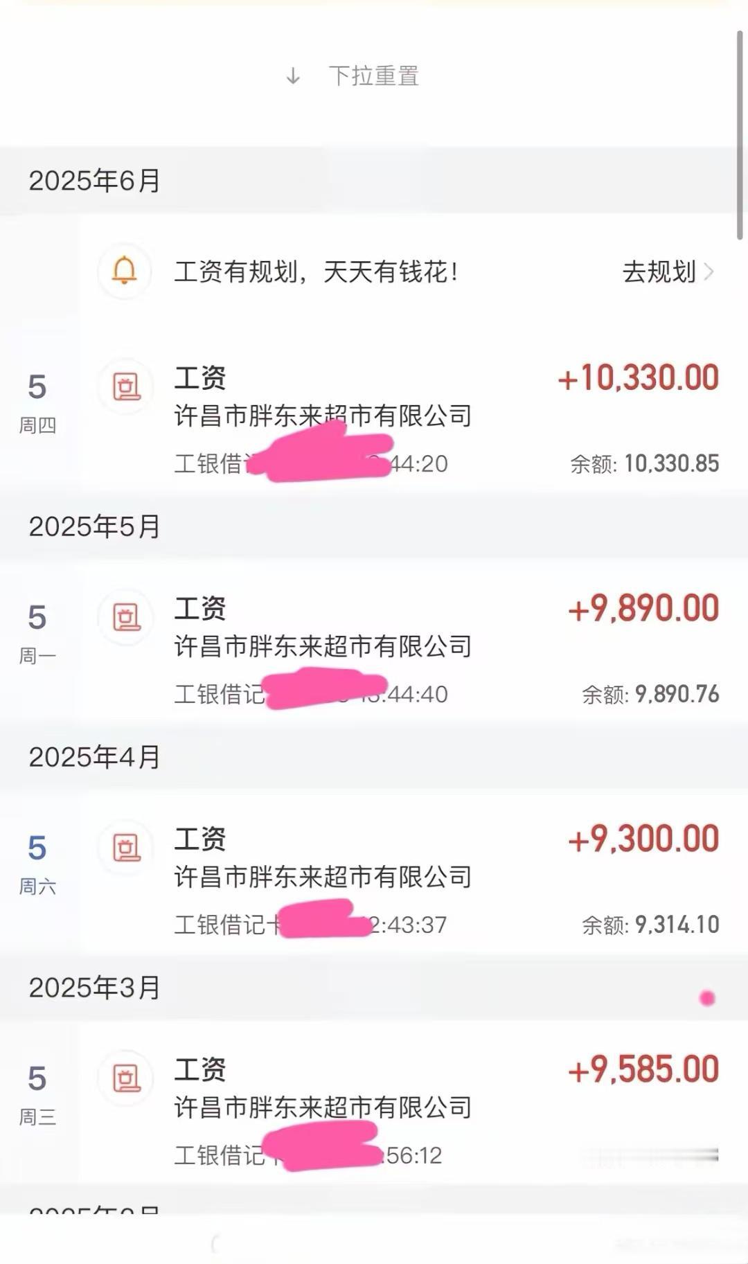 胖东来员工是不是不能在网上发视频和直播,全网几乎看不到胖东来员工的动态,就连工资记录全网也就那么一两张。 年初的时候,胖东来就宣称自己员工月平均工资已经达到9886,一个超市能有如此高的工资,这不妥妥的国内第一超市。 然而除了胖东来自己宣传时的月工资,以及后面这两条工资到账记录,全网找不出第4条工资记录。 这是否说明胖东来员工是不能随意在网上晒收入,又或者是员工的工资是对外保密的,之所以有这2条工资记录,就是为了证明员工已经达到了胖东来月平均工资。 另外,也很少看到胖东来员工在网上直播,或者发视频,网上说胖东来员工人数在8300左右,这么多员工,是如何统一做到不在网上分享自己生活的?