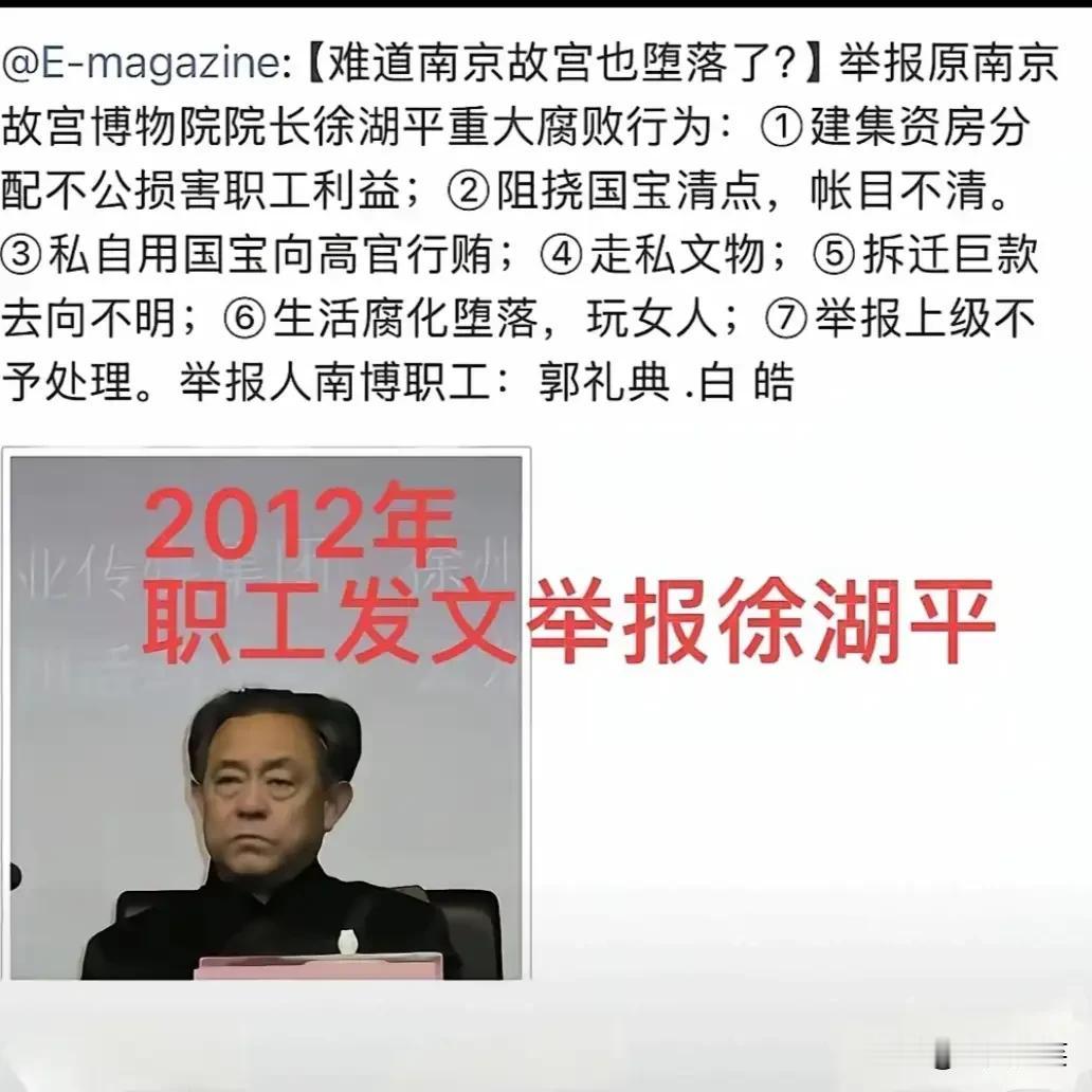 看来徐湖平当家南京博物院时问题确实很多,也很严重。 1,员工监守自盗被判极刑 2,自己被举报七宗罪 3,名画变赝品被白菜价处理