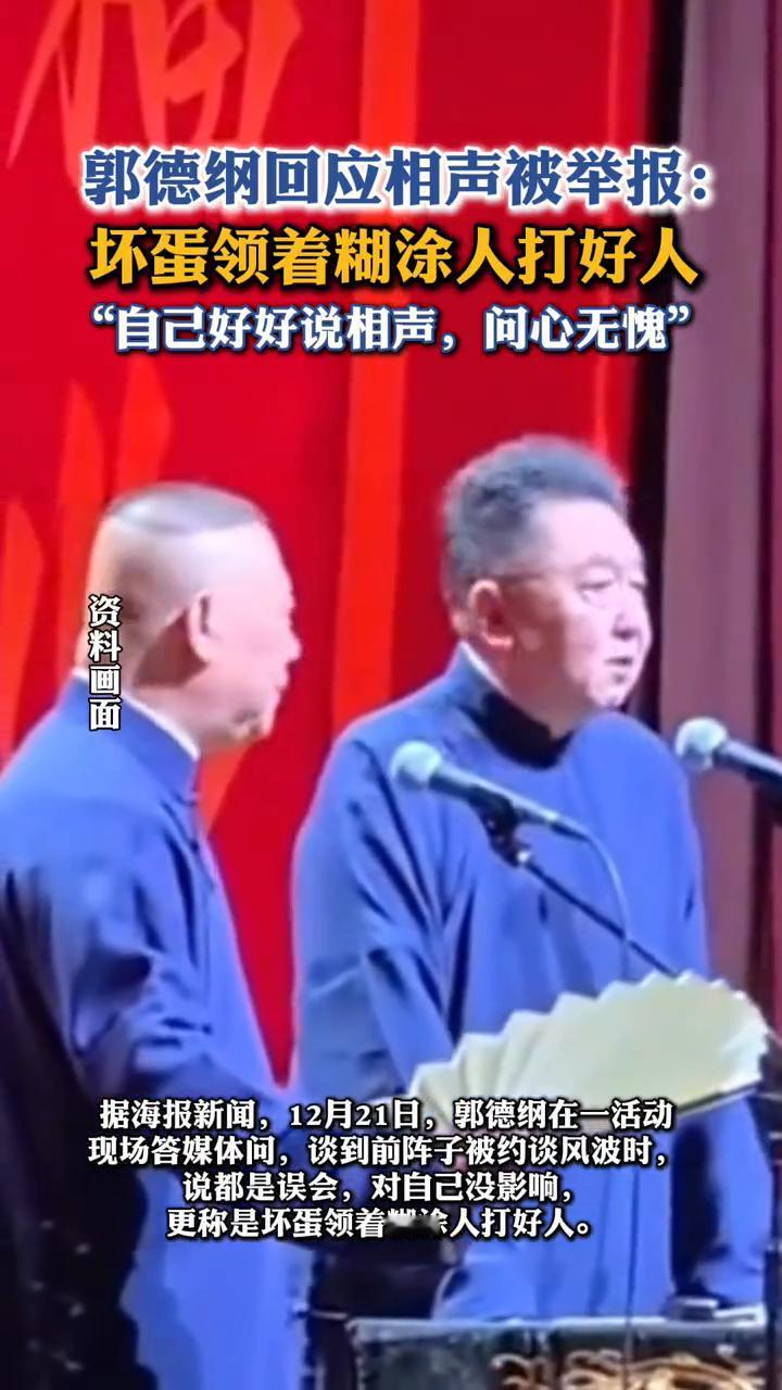 郭德纲回应相声被举报:坏蛋领着糊涂人打好人。 海报新闻。 "自己好好说相声,问心无愧"。据海报新闻,12月21日,郭德纲在一活动现场答媒体问,谈到前阵子被约谈风波时,说都是误会,对自己没影响,更称是坏蛋领着糊涂人打好人。 编辑:小岸。