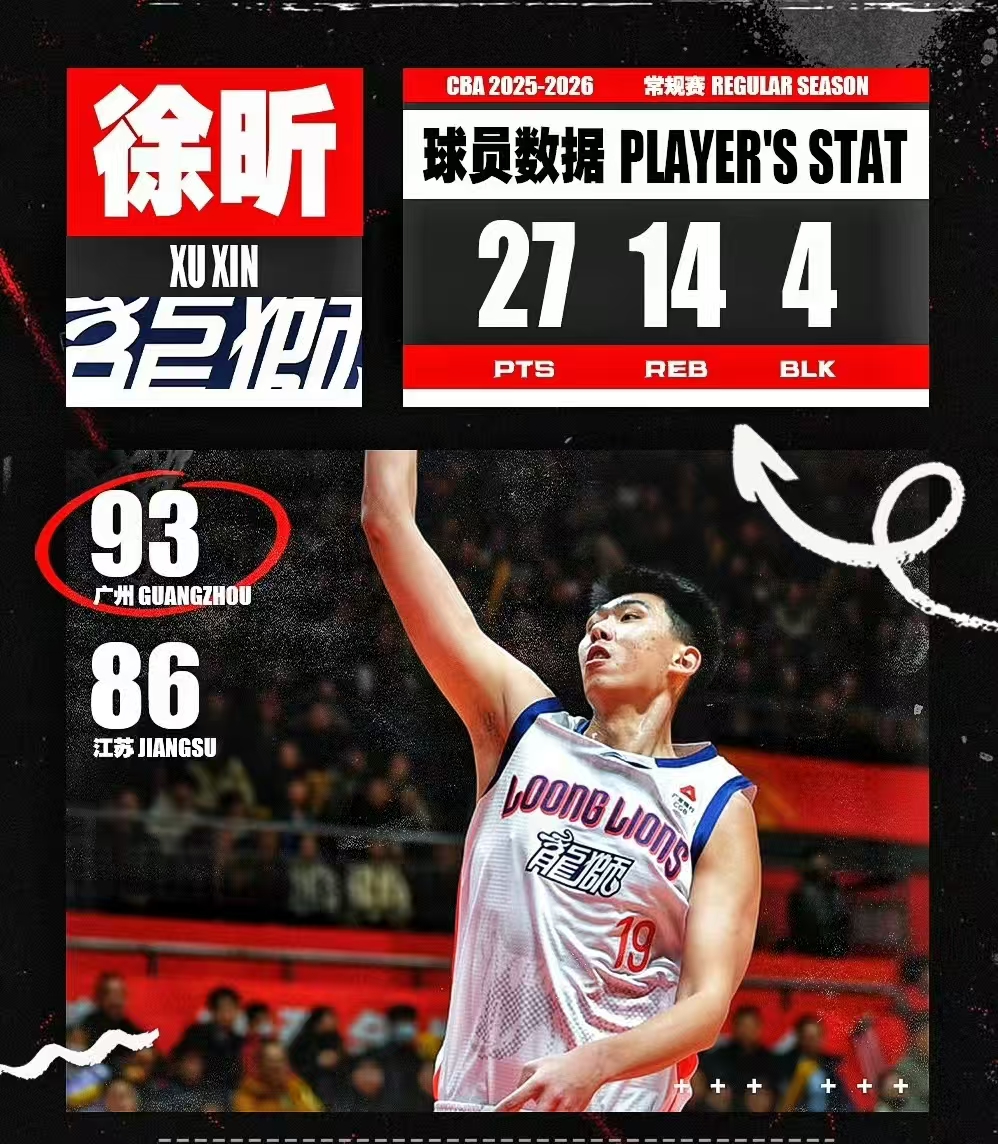 广州龙狮客场战胜江苏,广州打完三场比赛取得2胜1负的战绩,这场比赛徐昕彻底打爽了。上一场面对老东家膝盖磕伤,这场比赛徐昕并没受到影响,上场27分钟,砍下27分14板1助4帽的全面数据,并且只有一场失误。今晚徐昕这个表现完全是文班亚马附体,谁能想到上个赛季在广东还是小透明,现在已经成为广州的主力中锋。