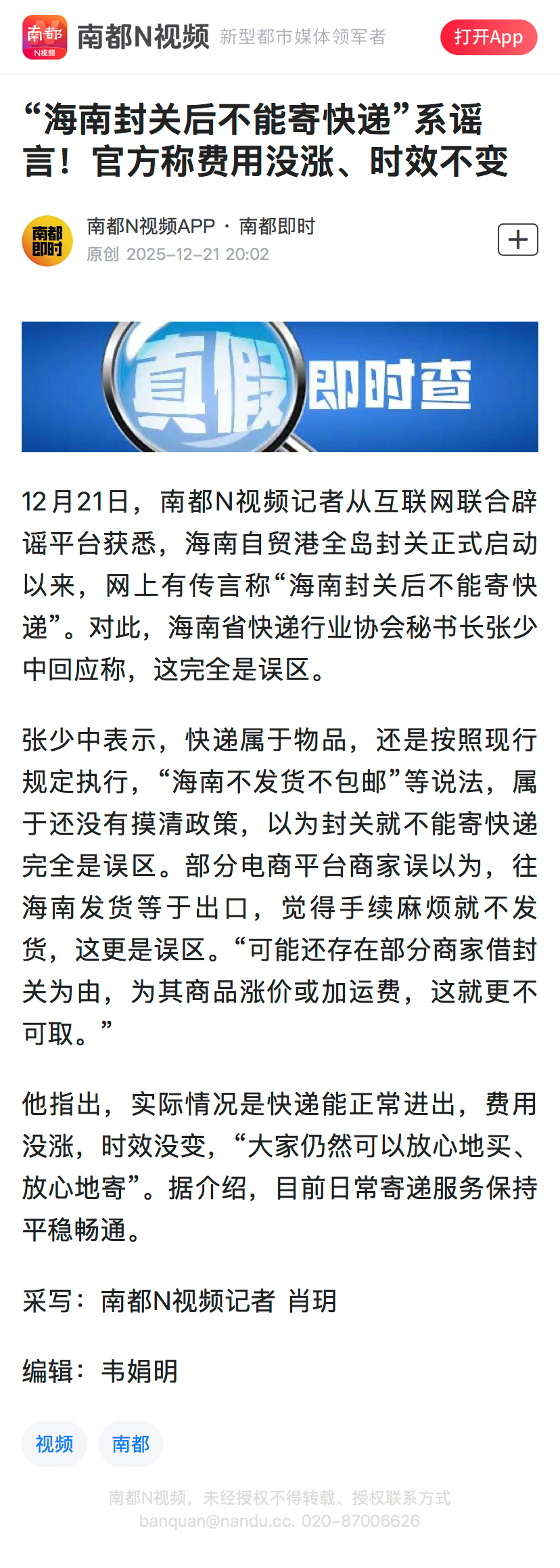 #海南封关不能寄快递是谣言#【“海南封关后不能寄快递”系谣言!官方称费用没涨、时效不变】#官方回应海南封关后快递政策#12月21日,南都N视频记者从互联网联合辟谣平台获悉,海南自贸港全岛封关正式启动以来,网上有传言称“海南封关后不能寄快递”。对此,海南省快递行业协会秘书长张少中回应称,这完全是误区。南都N视频记者 肖玥