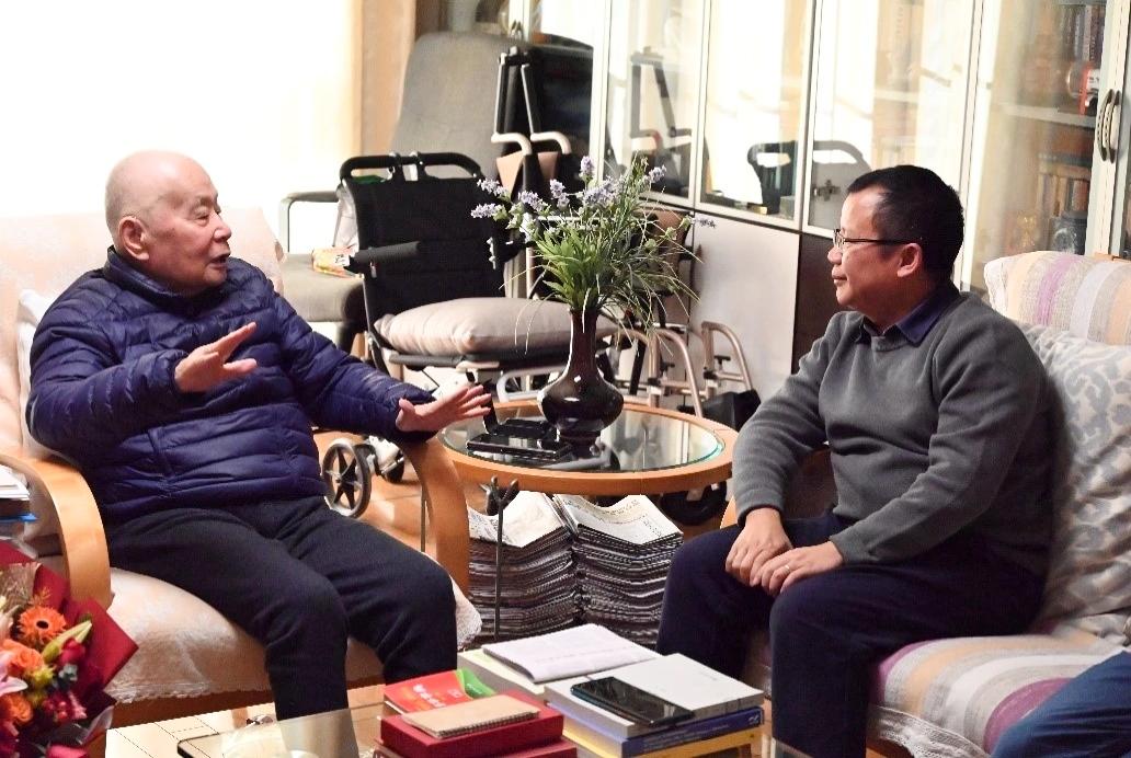 何祚庥老院士与一位戴着眼镜、衣着朴素的先生在交谈(图一)。交谈结束后,这位先生与何老院士、庆先生等人合影留念(图二)。 很多网友的心中可能就有疑问了,这位衣着朴素的先生是清华的哪位先生?这位先生不是旁人,他就是清华大学肖志刚教授。肖志刚教授现在管理清华物理系和天文系,其研究方向是核物理、重离子核反应动力学和先进探测器研发等方面。 清华物理系百年华诞之际,清华要了解老校友的求学故事,践行初心和使命,就特地拜访了一些老校友,这些老校友有何祚庥、刘广均和赵文津等先生。肖志刚教授亲自率众人登门拜访,此处也可以看出何老院士对于清华的影响力不一般。@何祚庥