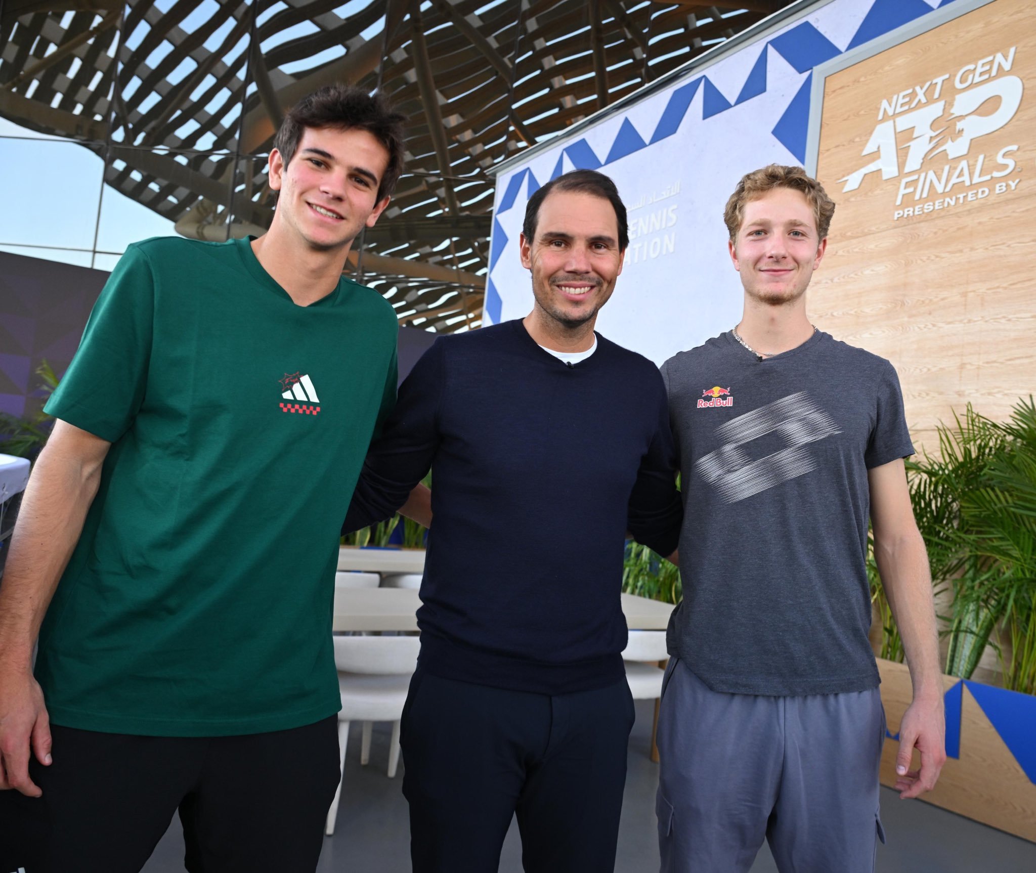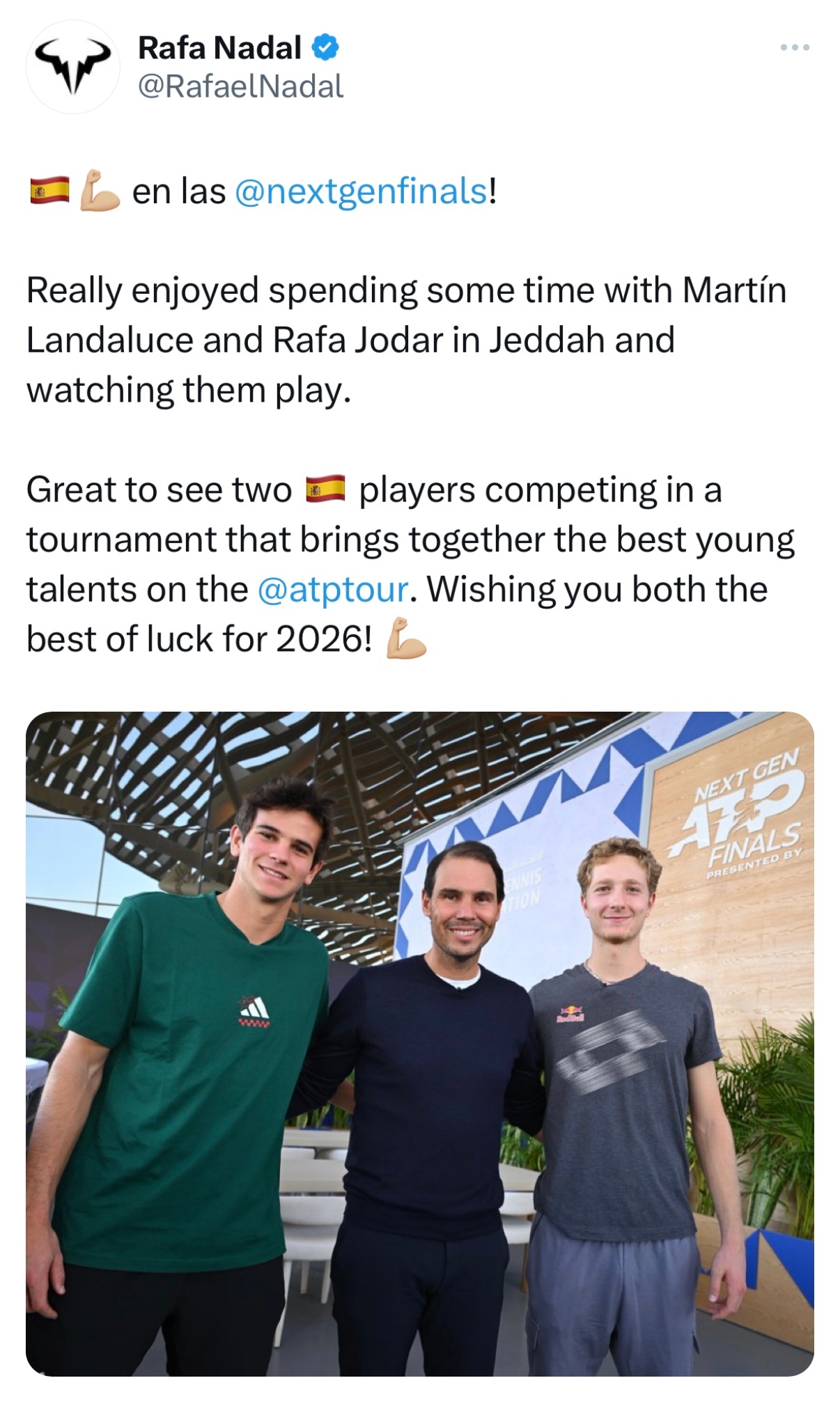 纳达尔在沙特吉达与出战ATP新生力量总决赛的西班牙新星兰达鲁塞和霍达尔见了面聊了天,他刚刚在社媒分享了三人的合照并祝福两位西班牙小兄弟2026赛季好运Vamos Rafa