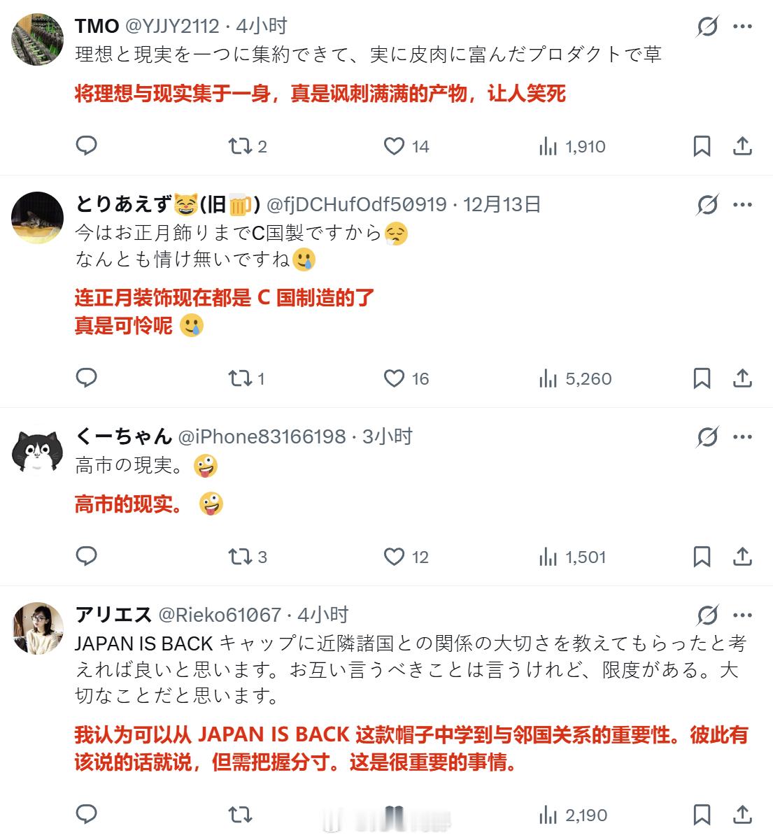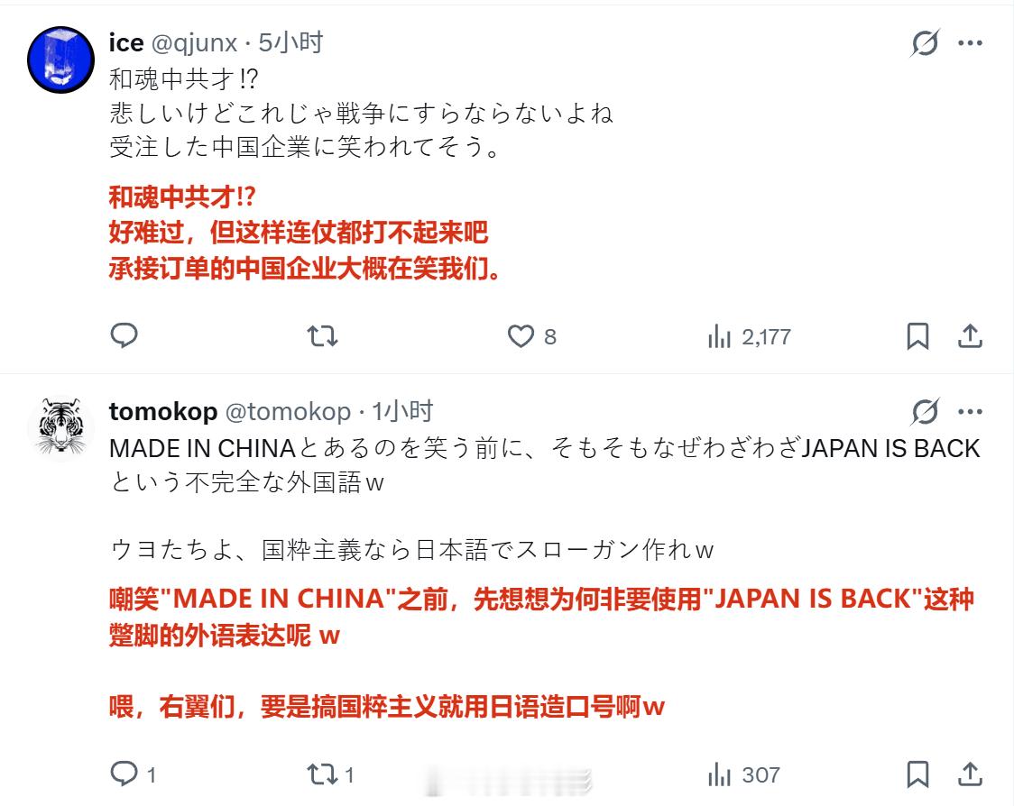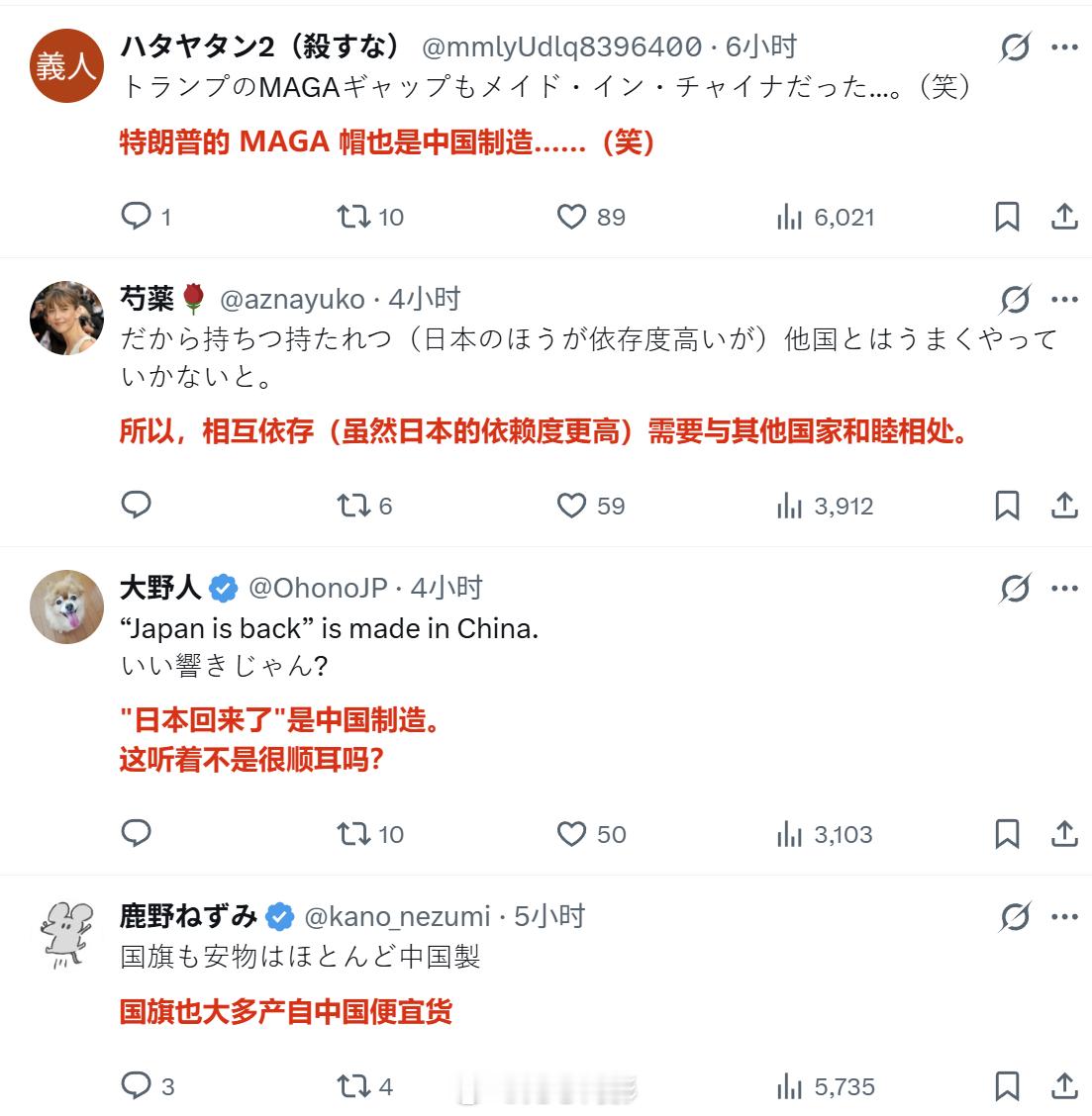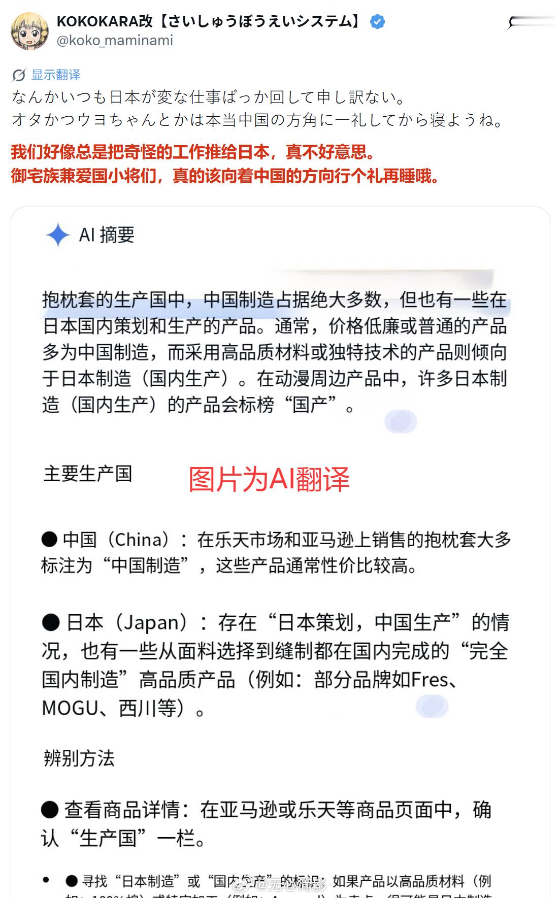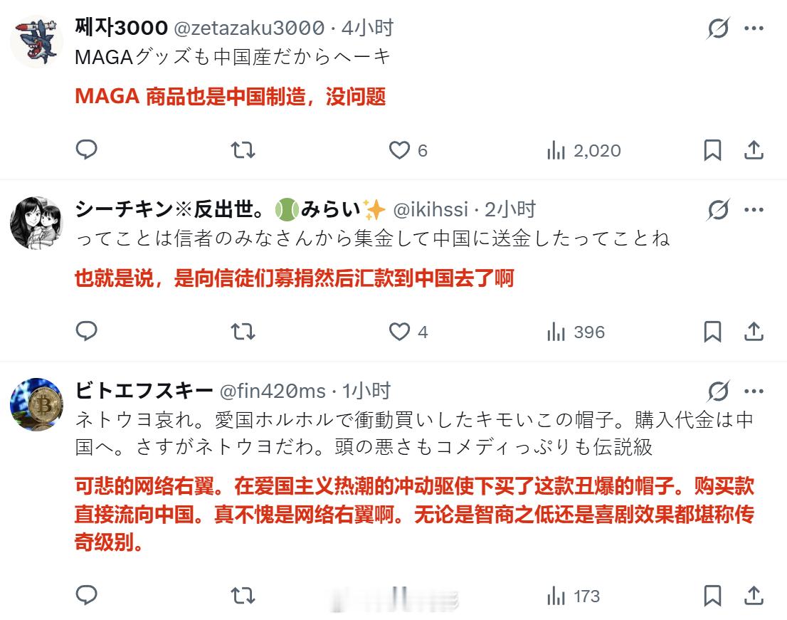 当日本网民发现,连JB的帽子都是中国制造之后,狠狠地嘲笑网络右翼。评论区提醒,没有中国的话,日本的御宅文化都无法存在,并建议日本御宅族兼爱国小将们睡前向中国方面行个礼……此外,有人还想起,那些向为做这款帽子向右翼们募捐的钱,难不成就是这样流向中国了?(那不然呢?)海外新鲜事中日外交局势