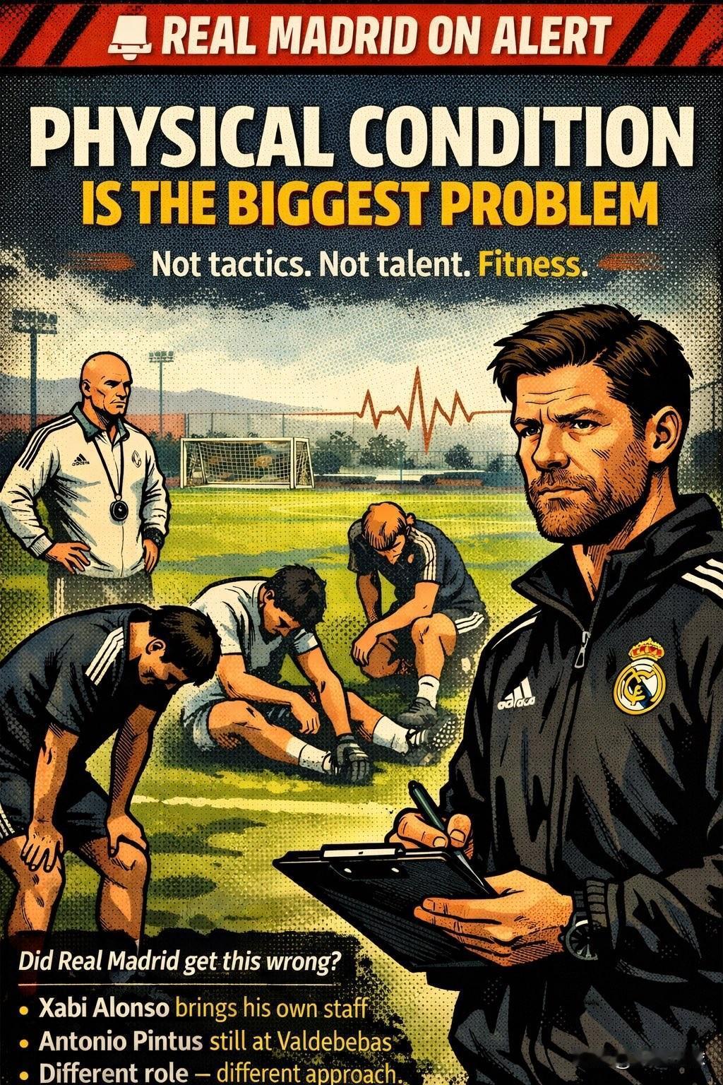 最新消息:目前皇家马德里最关心的是球队的健康问题。 阿隆索获准带上了他自己的教练团队,但球队目前的状况令人担忧。 安东尼奥·平图斯仍在瓦尔德贝巴斯工作,但职位不同了。 皇家马德里球员的体能状况并不佳,这并非轻微的疲劳,而是会影响到:压迫强度、攻防转换速度、伤病预防以及在90分钟以上的比赛中保持高水平发挥的能力。 即使是战术严谨的球队,如果球员的身体状态达不到最佳水平,也会举步维艰。