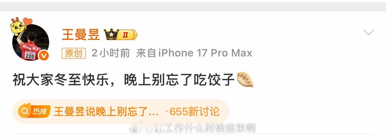 📢来自鳗鱼的节日问候王曼昱祝大家冬至快乐🥟🙌🏻发文:祝大家冬至快乐,晚上别忘了吃饺子🥟。王曼昱说晚上别忘了吃饺子
