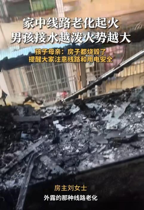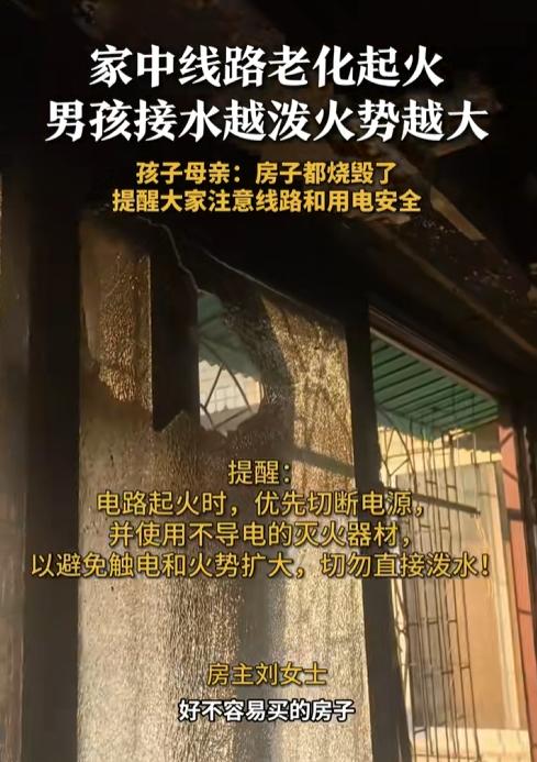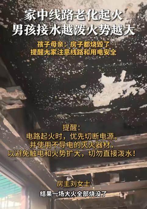 房子没有了!广东韶关,刘女士一家人在这里已经住了十多年,一直都是平安无事的。可就在前几天,刘女士的儿子因为不懂得如何正确灭火,导致整个家都被烧毁了! 当天下午,刘女士的儿子小杰独自在家,因为刚打完篮球回来,浑身是汗,便去冲了一个凉。 洗完澡后,小杰像往常一样,拿起吹风机准备吹干头发。可刚按下开关,只听见“啪”的一声,吹风机不转了,头顶的灯也熄灭了。并伴随着一股“烧焦”的味道。 小杰急忙顺着味道找了过去,他看到墙壁上的电线已经开始冒烟了。意识到是起火了,小杰第一时间想到的就是用水去灭火。 他急忙跑到卫生间,端来了两盆水,可想不到的是,这两盆水不仅没有起到灭火的效果,反而是有些助燃的作用了。 一瞬间,火势就蔓延开来,浓烟布满了整个房间。 小杰看到眼前的景象有些不知道怎么办了。踉跄着跑出家门,大声呼救。邻居们闻讯赶来,一边帮忙拨打119,一边将他带到安全地带。 消防员赶到后,迅速控制了火势,但已经太晚了。等王女士赶回来看到的情景就是熏得漆黑的墙壁、烧得只剩框架的家具,以及满地狼藉的灰烬和水渍。 可以说:什么都烧没了! 经过消防初步确认,这场火灾的起因是因为房屋线路老化造成的。 说真的,现在有不少家庭都抱着:“没坏就先对付用的想法”。想着换掉一些还能用的东西,总是感觉在浪费。可跟一场大火相比较的话,哪个损失更大,相信大家都能明白的。 还有一点,相信在学校里面、家里都没少教孩子“着火了应该怎么办”。可真事到临头的时候,这个半大孩子第一时间还是想着用水去救火。 或许,孩子的理论知识是有,但遇到真实情况的时候,有些蒙了,有些忘了。那么可不可以搞些实际的演练了。让孩子们养成肌肉记忆。也不至于关键的时候“忘”了很多关键的事情呢? 不管怎么说,现在事情已经发生了,也无法挽回了,但好在人没有事。这也是最大的幸运。相信,只要人没事,家会慢慢的建立起来的。日子也会一天天的好起来的。