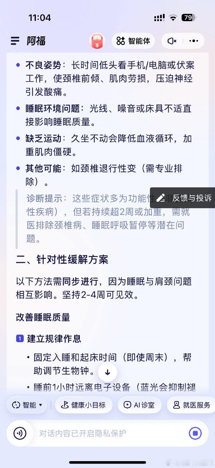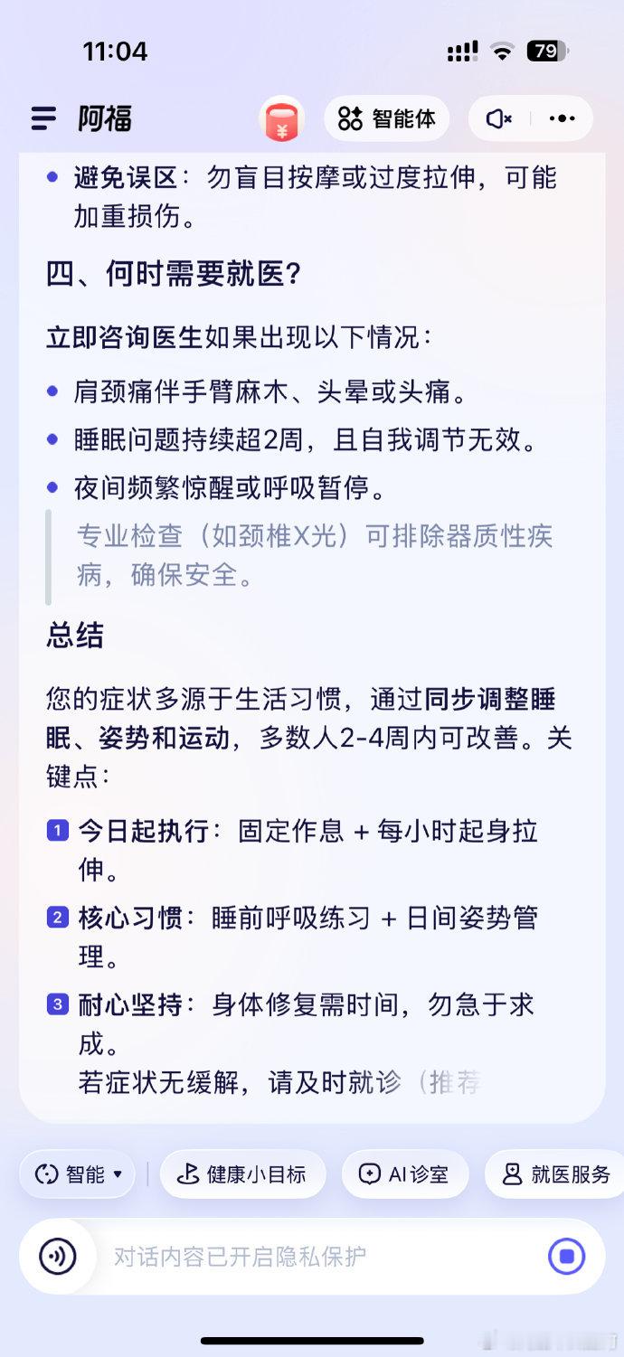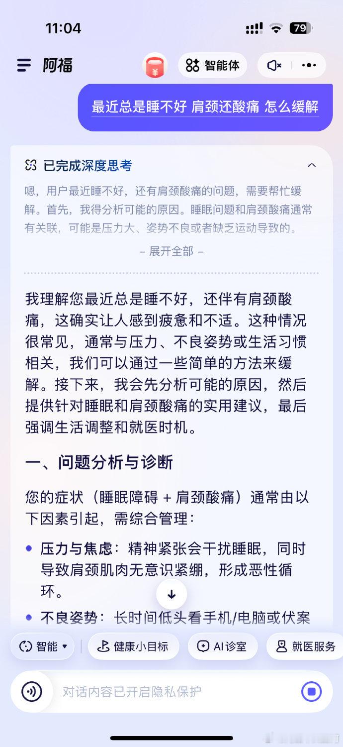 最近肩膀有些酸胀,夜里躺下时感觉尤其明显。忍不住用手机查了查,凌晨三点的搜索引擎,非但没给我答案,反而像往失眠的火堆里添了把柴。越看越心慌,翻来覆去怎么也睡不着。我和朋友倾诉自己的担忧,她说这么晚了要不你上蚂蚁阿福问一下,我忐忑的打开蚂蚁阿福,我详细描述了不适的位置、感觉,也坦白了那些让我辗转反侧的可怕猜想,它的回复很清晰:先列出了几种最常见的原因,比如久坐、姿势问题;然后解释了什么情况下才需要真正重视。最让我安心的是这句:“根据您的描述,这种情况多数与肌肉疲劳有关,不必过度焦虑。”“不必过度焦虑”这几个字,让我安心了很多,和那些零碎信息论断完全不同,它不是随意安慰,而是建立在专业分析基础上的理性参考。它让我真切的感受到,我的担忧被认真对待了,所有的疑问也在合理范围内得到了解释,这才终于安心睡去。后来每次当我又开始胡思乱想时,我都会上阿福问一问,原来真正缓解失眠的,有时不是助眠音乐,而是一份让人安心的专业参考。蚂蚁阿福给我的就是这种感觉,它接住了我的焦虑,用清晰的信息帮我划清了“合理关注”和“过度恐慌”的界限。后半夜睡不着让名医专家哄睡