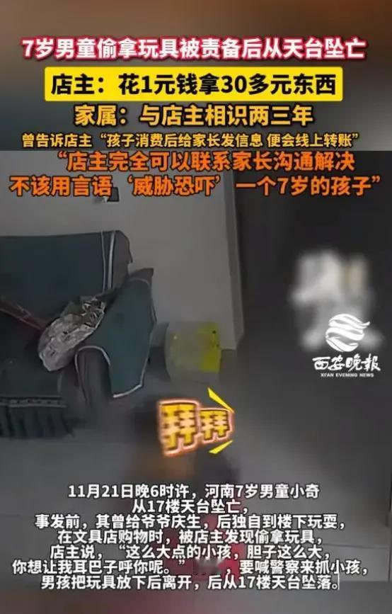 就为了一块几毛钱的奥特曼,孩子没了!河南这起悲剧,真的让人心塞塞的。 7岁小杰在熟人店里拿了个玩具,被老板发现后说了句叫警察叔叔来问你。孩子没哭没闹,默默走出店门,23分钟后,竟从18楼天台坠下​ 。一条鲜活的小生命,瞬间定格。 家长心痛又委屈!和店主认识两三年,平时孩子拿东西都是先记账后转账,这次为啥不直接联系家长,非要吓唬孩子?可店家也委屈,就责备了几句,哪能想到娃这么脆弱? 警方调查后认定没有违法事实,终止调查。可网友吵翻了!有人觉得店家冤,教育偷拿没错。也有人认为,对7岁娃该多份耐心,联系家长才是上策。 这事儿吧,说到底,一句无心的话,可能成为压垮孩子的最后一根稻草。除了追究责任,我们更该想想:怎么在孩子犯错时,既给教训又给温暖?小区的天台安全网,又是否扎牢了?