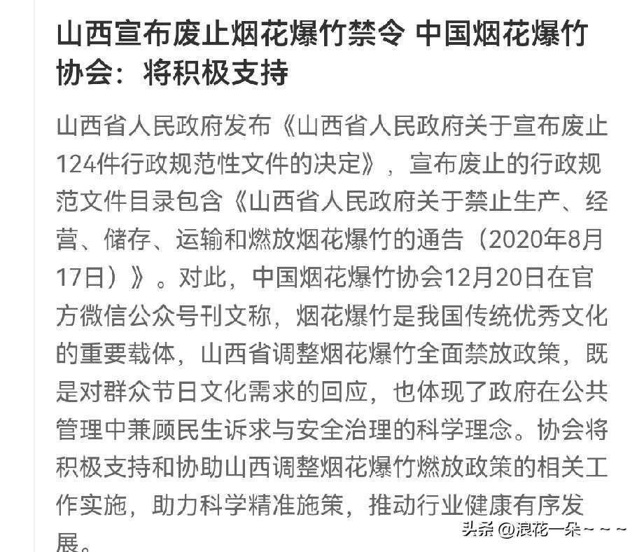 A股小利好!拿走不谢! 何为跨年行情?得有鞭炮声啊。鞭炮声一响,过年的氛围才浓啊!对于A股也是如此,要有好消息,好情绪看多的才多! 我看了新闻,山西宣布废除烟花爆竹禁令,而且烟花爆竹协会还将要积极支持。 不用多说,这当然对烟花爆竹企业是个利好,试想一下,如果你家是开烟花爆竹厂的,得到这一个消息后,还不乐活半天,因为那需求肯定比之前多了去了,你的收益生产也会很忙很忙啊。 当然也许是阶段性的利好,不过,试想一下,如果好多省份都放开了,那么对于相关企业的拉动作用可就大了,这也许个别地方刺激消费的一个实际举措吧?其实,我都真担心你周一龙头买不上!因为,上市公司就那么几家! 小利好小利好,大家也不要太执着,但是,要关注,要会做短线![捂脸]
