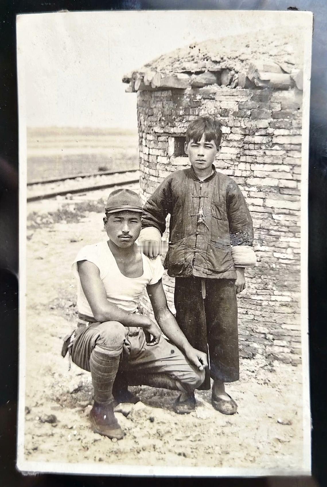 这是从日军随身携带的挂包搜出来的一张照片。在一座日军修建的碉堡面前,一名中国少年和一名日军士兵的照片。这个少年看上去年纪不大,大概有15、16岁的样子,穿着布衣、布鞋,家境应该不富裕。他把手搭在日军的肩膀上,以示友好。然而他不知道的是眼前的这个日军兽兵有多危险。照片没有备注,我们无从知晓这个少年的结局。