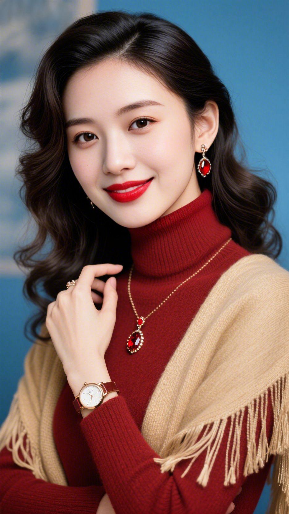 《暖红映柔蓝》 浅蓝背景像笼了层软雾,她颈间的酒红针织先浸暖了视线——米黄披肩的流苏垂在臂弯,随指尖轻抬漾开软绵的弧度,连周遭空气都裹了层温软的绒感。 耳坠与颈链的红晶相衬,像把春日的淡艳凝在光影里,唇色是恰好的明丽,笑起来时,眉梢都浸着舒展的暖意。原来温柔从不是寡淡无色,是暖红撞柔蓝的妥帖,是日常里被认真拾掇的、轻缓的欢喜。 这模样从不是刻意雕琢,是把生活的细碎日常,织成了妥帖又舒展的好看模样。 暖调温柔穿搭 日常轻暖氛围