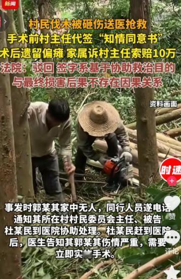 “讹天讹地讹空气!”河南夏邑,男子伐树时,不慎被树木砸伤,被送去医院。医院说情况危急,必须立刻做手术。因家属不在现场,村主任就在麻醉协议书和手术治疗知情同意书上签字。谁知医院诊疗出错,导致男子偏瘫,赔偿男子126939.1元。之后,男子又把村主任告上法庭,说他未经过伤者和家属同意签字,导致偏瘫后果。索赔10万,案子先后经过两审,法院这样判了! 2020年7月,河南夏邑县人民法院庭审现场,一场特殊辩论激烈进行。 原告郭某其坐轮椅神情凝重,被告村主任杜为民满脸委屈无奈,官司核心并非医疗事故责任,而是8年前一次善意救助的边界——杜为民紧急代签手术同意书救下郭某其,如今被索赔10万元。 郭某其代理人当庭提出:“杜为民未经授权代签手术文书,直接导致医院实施不当手术,致郭某其偏瘫,理应担责。” 这番话引发法庭外骚动,二十多名自发旁听的李庄村村民纷纷议论,为杜为民鸣不平。 纠纷根源要回溯到2017年3月4日下午。 豫东平原春寒未消,李庄村头林地内,郭某其与四位工友砍伐村里规划清理的老杨树,经验丰富的他负责最后砍伐环节,众人已提前清理障碍,看似万无一失。 意外突然发生,郭某其砍断树干最后连接部时,树根在松软土壤中滑动,水桶粗的杨树侧翻砸向他,“嘭”的闷响后,他被死死压住失去声息。 工友们急忙推开树干,见郭某其脸色青紫、双眼紧闭,后腰棉袄被鲜血浸透,呼吸微弱。 有人颤抖着拨通120,有人翻找家属联系方式,仅找到一部老旧按键手机,拨打其妻子号码始终无人接听——后知其妻子带孩子回邻县娘家,手机落在家中。 120急救车赶到后,医护人员初步诊断:“腰椎粉碎性骨折伴内脏出血,已失血性休克,必须立刻手术,晚一分钟就可能没命。” 但补充说明让工友们两难:“手术需家属签字,家属赶不到需责任人代签,否则无法启动。” 常年种地的工友们文化程度不高,不敢承担签字责任,急得满头大汗的老张一筹莫展时,有人提议找村主任杜为民:“他处理过不少村里急事,肯定能拿主意。” 此时杜为民正在村委会调解宅基地纠纷,接到“有人被树砸伤病危需签字手术”的电话后,立刻放下土地台账,跟争执村民说明情况便急匆匆跑出村委会,骑上三年旧电动车赶往医院。 15公里路程需经三个繁忙十字路口,他一心救人顾不上红绿灯,几次闯红灯险些出事,甚至差点撞上小货车也未回应。 下午4点10分,气喘吁吁的他冲进急诊室,主治医生已持麻醉风险告知书和手术治疗知情同意书等候。 “你是村主任杜为民吧?”医生确认身份后急促说道,“患者生命体征不稳定,腰椎骨折压迫神经、内脏仍出血,必须马上手术,我们多次联系家属无果,你能代签吗?” 杜为民目光在文书与奄奄一息的郭某其间切换,内心激烈挣扎:签字要担未知风险,不签郭某其可能当场丧命。 急诊室里脚步声与仪器滴答声交织,他踱步半分钟后,深吸一口气接过笔:“签我的名字,先救人!”笔尖落下时手微微颤抖,这是对生命的敬畏。 次日凌晨2点,医生宣布手术成功,郭某其脱离生命危险,杜为民悬着的心放下,待郭某其被推进重症监护室后,才拖着疲惫身躯回家。 为治病,家里花光积蓄还借了十几万元外债。 2018年,郭某其家人将夏邑县人民医院告上法庭索赔医疗过错责任。 专业鉴定明确医院手术复位失误是伤残直接原因,2019年法院判决医院赔偿医疗费、残疾赔偿金等共计126939.1元。 但拿到赔偿的郭某其情绪未平复,将不幸归咎于杜为民:“不是他擅自签字,医院就没法手术,我也不会瘫痪,他必须再赔我!” 回到庭审现场,杜为民代理人当庭反驳:“杜为民的行为属典型紧急救助,符合《民法典》第184条规定。 他与郭某其无亲属关系、无法定救助义务,签字纯出于善意。 当时郭某其生命垂危、联系不上家属,符合紧急性要件。 伤残是医院过错导致,与代签无直接因果关系,代签仅为启动抢救。” 村民证言也印证这一点,大家纷纷表示杜为民救人心切,平时就乐于助人,愿为其善意作证。 郭某其不服上诉,2020年9月商丘市中级人民法院驳回上诉、维持原判。 直到2025年12月,河南省高级人民法院将该案作为典型案例公布,明确紧急救助法律保护边界,这场持续8年的拉锯战才彻底落幕。 案件结束后,杜为民接受采访时说:“这8年我无数次质疑自己,如今公正判决下来,心里的石头总算落地了。 以后再遇到需要帮助的人,我还是会伸手,只是会提前做好证据留存。” 危急时刻挺身而出者付出勇气与担当,不应陷入官司困境;患者及家属遭遇不幸时,应理性维权找准责任主体,而非转嫁不幸。 相关部门更需完善紧急医疗场景制度设计,建立全国统一紧急联系人备案系统、明确代签人资格与责任边界、加强医疗机构监管减少过错,方能让善意救助者无后顾之忧,让需要帮助的人及时获救,让社会始终充满温度。 那么到最后,你们怎么看呢?
