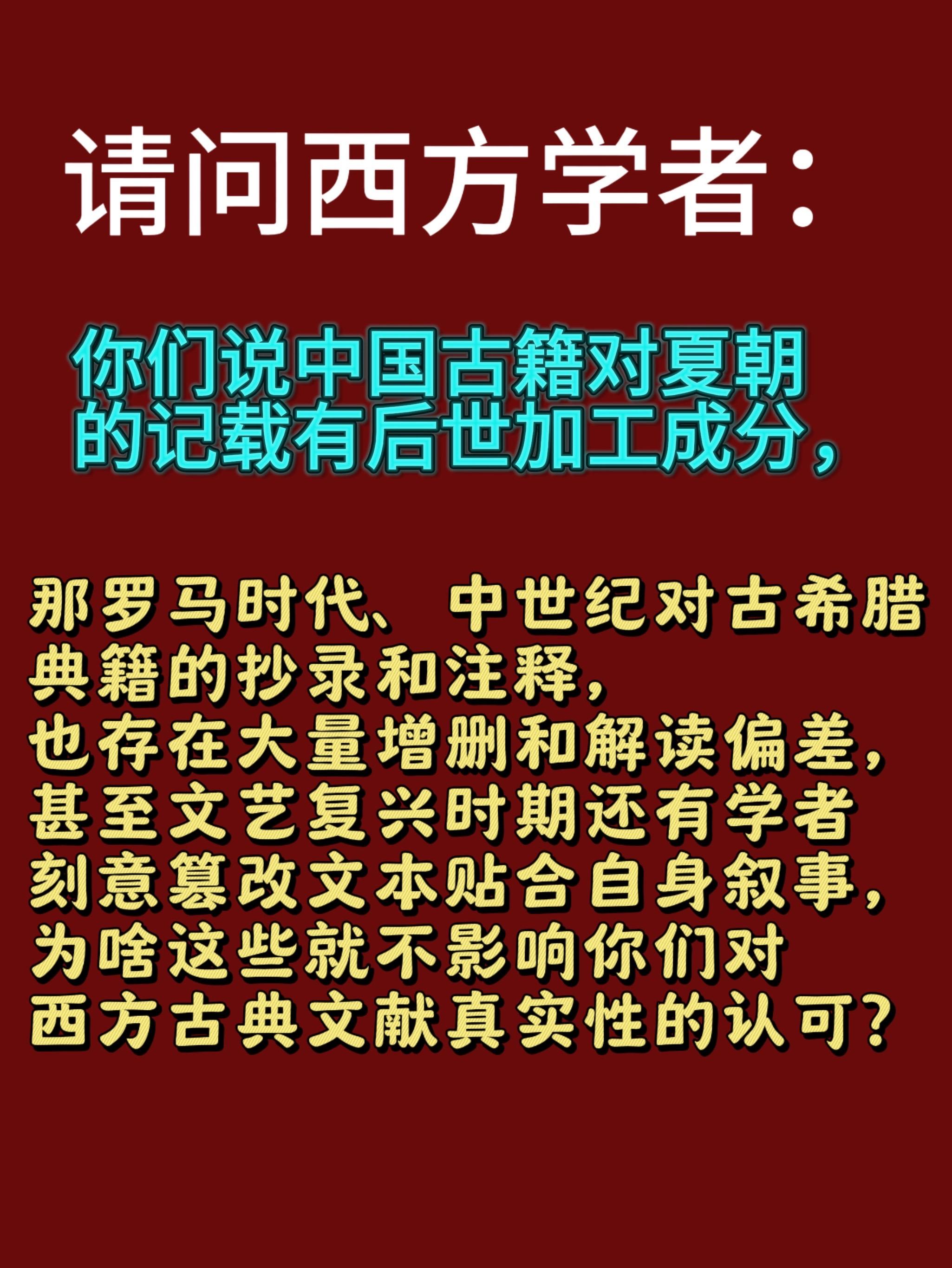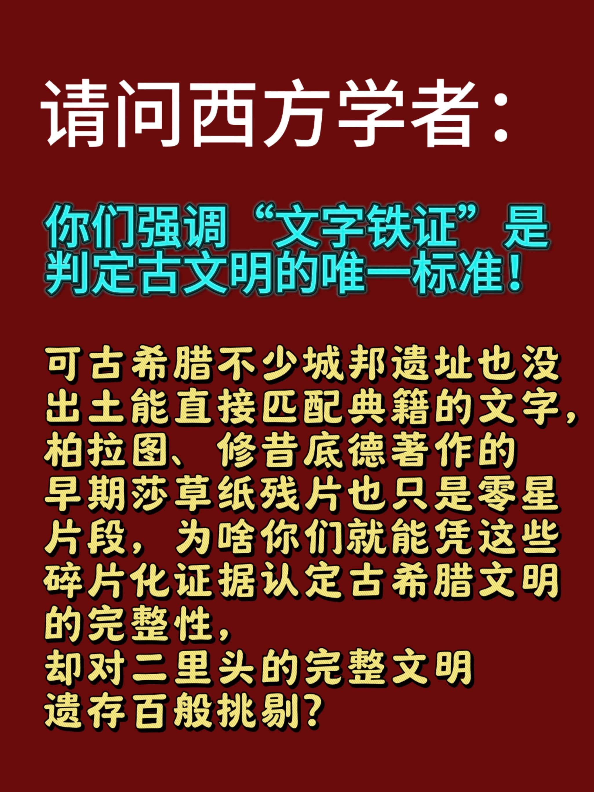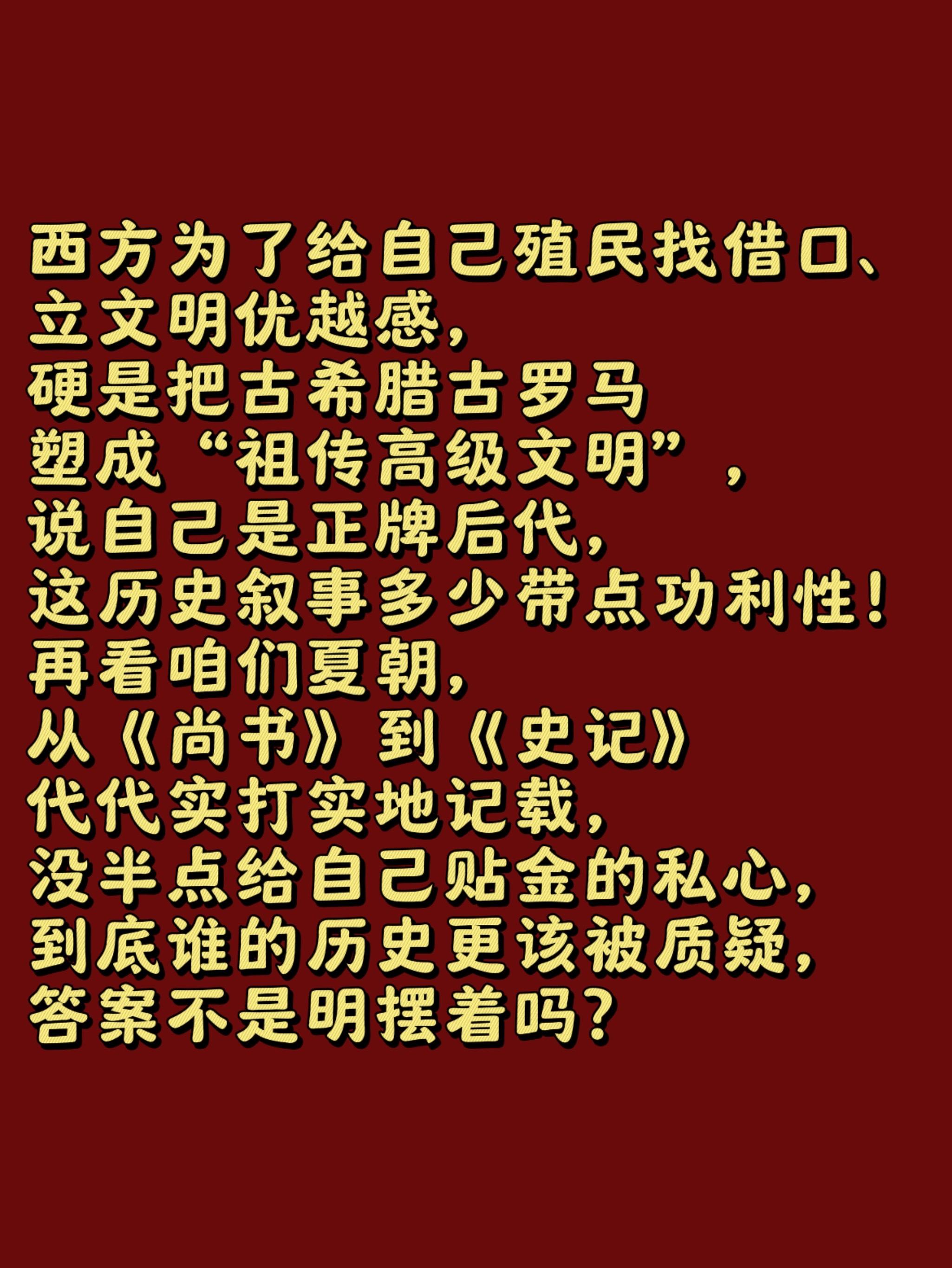 西方近代的文明叙事,打从一开始就藏着私心。为了彰显自身优越、给殖民扩张找合理借口,他们刻意拔高古希腊古罗马的地位,把自己包装成“高级文明直接后代”,甚至将《荷马史诗》这类神话诗歌生搬硬套成正史,靠文学臆想拼凑文明脉络,其不靠谱程度早已不言而喻。反观中国对夏朝的记载,从先秦典籍到汉代史书一脉相承,全程无半点文明优越论的功利动机,这种实打实的史料记载,远比带目的建构的“伪历史”更经得起时