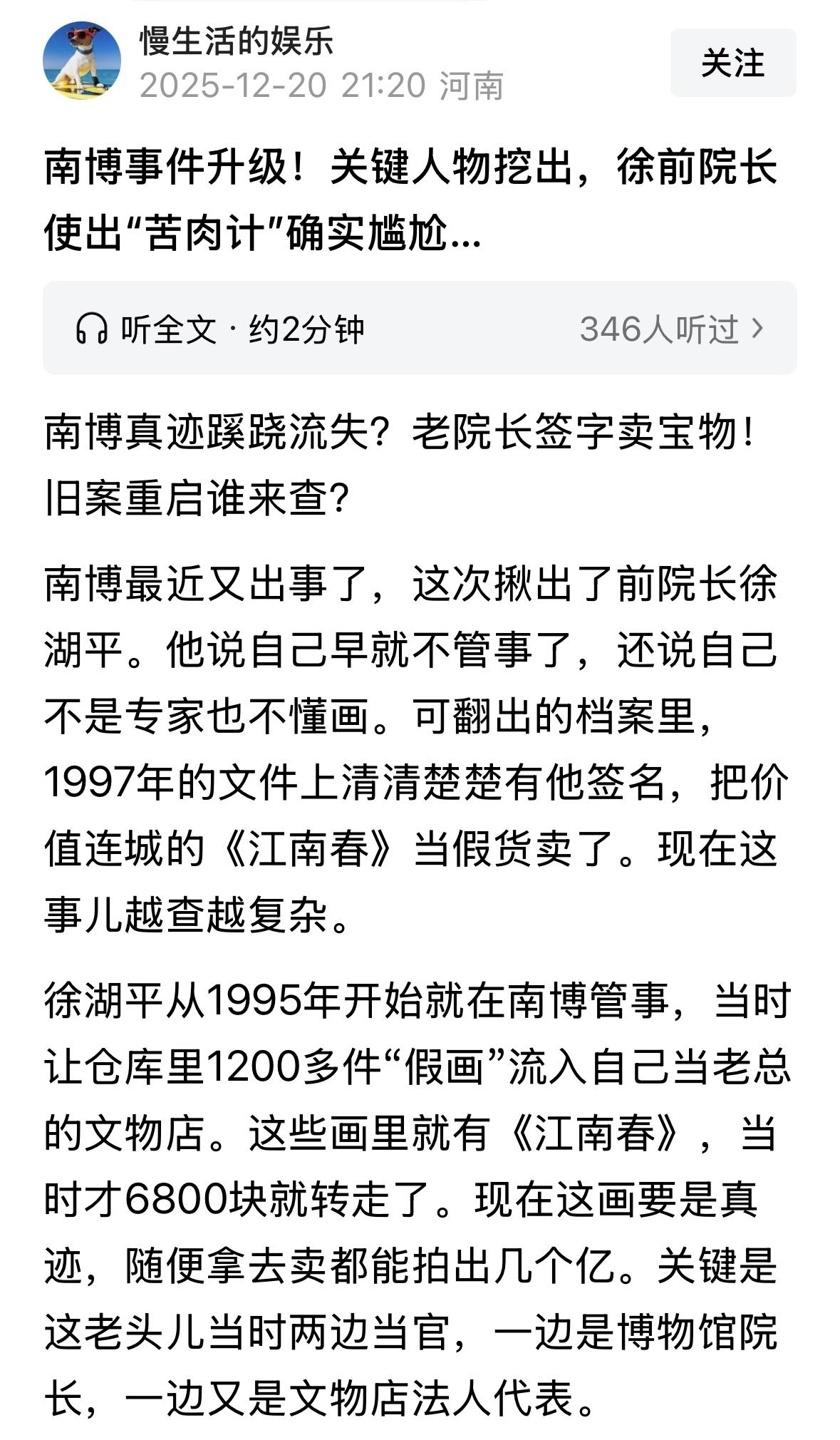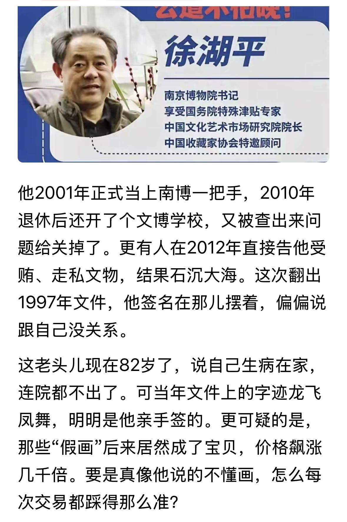 自称南京博物院职工的一个老人,实名举报前院长盗窃博物院文物,他说,在前些年,南京博物院40多人签名举办,涉及到省司法部门有关领导。前院长在接受采访时,表示,自己80多岁了,也不了解有关事情,自己也不是砖家。究竟如何?我们拭目以待,不管是谁,如果涉嫌犯罪,80多岁不是免死金牌。
