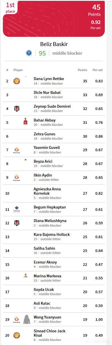【王媛媛局均拦网排名土超第一】土耳其女排联赛上半赛季拦网(BLOCK)榜1、 总拦网 🇹🇷 45个 × 贝利兹🇺🇸 35个 × 雷特克🇹🇷 33个 × 迪洁🇹🇷 32个 × 泽内普·苏代🇹🇷 31个 × 巴哈尔🇹🇷 30个 × 泽赫拉🇹🇷 29个 × 亚瑟敏🇹🇷 28个 × 贝伊扎🇹🇷 28个 × 伊尔金🇵🇱 27个 × 科内卢克🇹🇷 27个 × 贝居姆🇺🇦 26个 × 梅柳什基娜🇺🇸 25个 × 巴杰马🇹🇷 25个 × 萨利哈2、局均拦网🇨🇳 1个 × 王媛媛(19拦)🇹🇷 0.92个 × 贝利兹🇹🇷 0.86个 × 泽赫拉🇺🇸 0.83个 × 雷特克🇵🇱 0.82个 × 科内卢克🇺🇸 0.81个 × 巴杰马🇹🇷 0.76个 × 巴哈尔🇹🇷 0.69个 × 迪洁🇹🇷 0.69个 × 埃达🇹🇷 0.67个 × 亚瑟敏🇹🇷 0.67个 × 贝伊扎🇹🇷 0.65个 × 泽内普·苏代🇹🇷 0.65个 × 伊尔金🇹🇷 0.64个 × 萨利哈女排国际排坛动态王媛媛