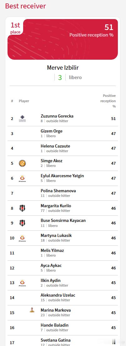 土超女排上半程结束一传榜排名。自由人梅尔维领跑,主攻格雷卡排名榜二,奥格和阿克孜分列第三和第五,卡绍特排名第四,武卡西克排名第十。女排土耳其女排超级联赛