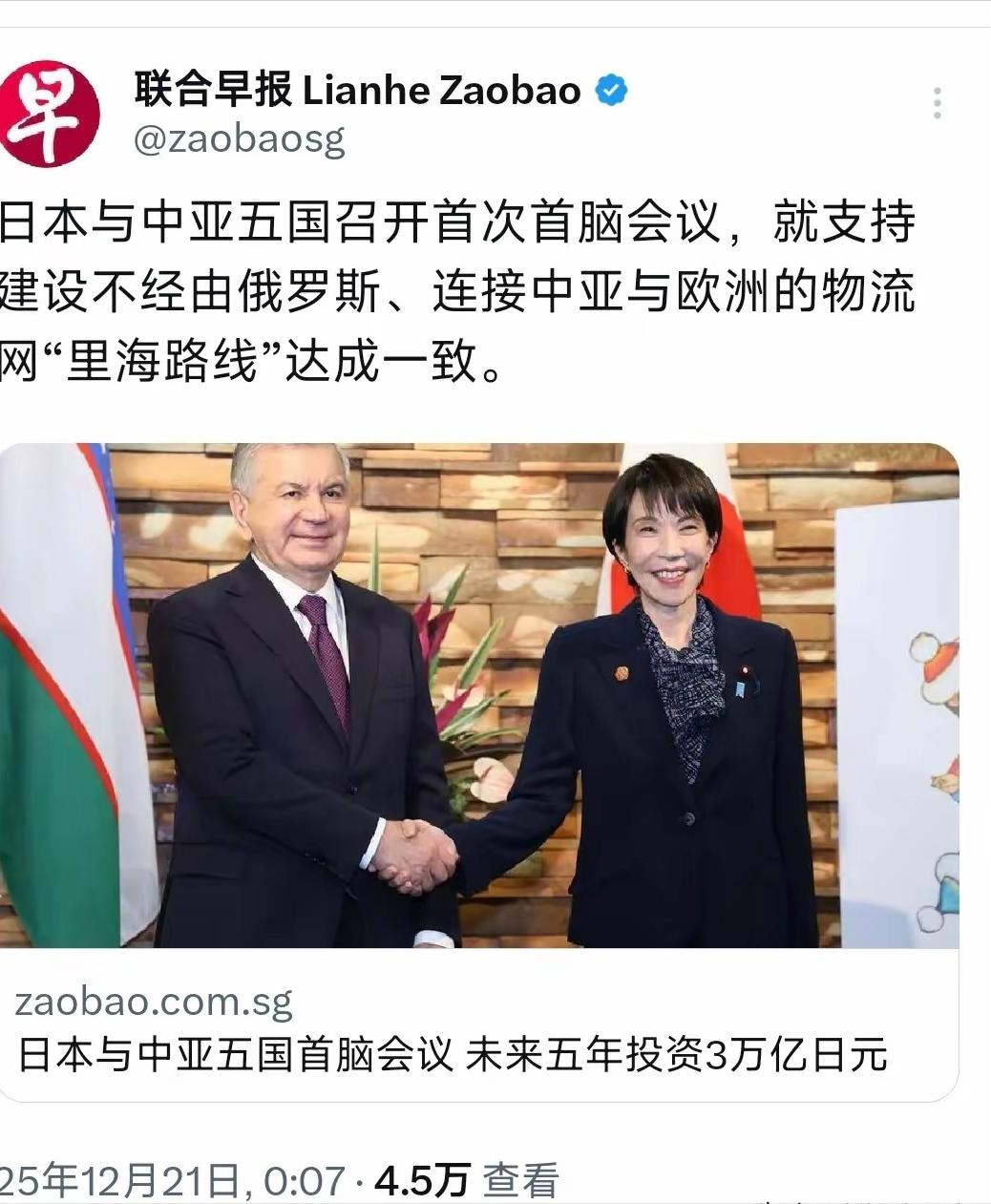 日本与中亚五国签订《东京宣言》,其核心就是日本要中亚五国的矿产资源与能源售卖到日本,而这些资源如何抵达日本,空运,海运 ,陆运? 日本这是急着给自己的资源供应找条“后路”,背后的算计可不少。 作为一个资源匮乏的岛国,日本的高科技产业比如汽车、半导体,全靠海外资源撑着。 而中亚这地方,简直是个“资源宝库”,石油、天然气储量丰富,还有稀土、锂、钴这些新能源和电子产业离不开的关键矿产,至少20种矿产的探明储量都能排进全球前列。 以前不少资源要经过俄罗斯运出来,但俄乌冲突后,这条路线的风险越来越高,日本心里直打鼓,生怕哪天资源供应断了档。 这次跟中亚五国搞合作,光是给哈萨克斯坦的能源冶金领域就砸了37亿美元,还承诺未来5年要落地3万亿日元的商业项目,说白了就是用真金白银换资源优先获取权。 关键是那条绕开俄罗斯的运输线,其实就是依托“跨里海国际运输走廊”搞的“中间走廊”。具体路线大概是从哈萨克斯坦的里海港口装船,穿过里海到阿塞拜疆,再经高加索地区到土耳其,最后连到欧洲,日本再通过这条线路把中亚资源运回国内。 为了让这条线通得顺畅,日本不仅要帮着升级沿线的铁路桥梁,还打算培训海关官员,推进通关数字化,就是想解决路线上基础设施差、各国标准不统一的问题。毕竟空运成本太高,陆运又绕不开俄罗斯,这条海路为主、陆铁衔接的路线,成了日本眼里的“最优解”。 日本这么急着忙活,还有个重要原因是周边外交不顺。高市早苗内阁上台后,在涉台问题上乱说话,把周边不少国家都得罪了,外交上陷入困境。 这次高调跟中亚五国开首脑峰会,拉着丰田、三菱这些大公司组团站台,签了34份合作协议,其实也是想搞“剧场外交”,营造自己外交活跃的假象,挽回点执政颜面。 中亚是中俄的传统合作区域,中国早就稳居中亚五国最大贸易伙伴,俄罗斯也通过多个机制保持着影响力。 日本想借着这条运输线和合作项目,在欧亚大陆腹地插一脚,削弱中俄的影响力,帮着美国在这一区域布局,说白了就是“远交近攻”的老套路。 不过,日本的如意算盘能不能成,还得打个问号。首先地理上就有天然障碍,日本和中亚相隔万里,没有陆地相连,就算修好了“中间走廊”,运输时间和成本未必比现有路线有优势,而且沿线各国的基础设施和政策协调都是难题。 中亚国家很清楚自己的位置,不想卷入大国博弈,中俄在当地的经济和安全影响力不是日本随便就能替代的。 日本想靠砸钱就把中亚拉到自己这边,还想绕开俄罗斯搞运输,恐怕没那么容易。 总的来说,日本这次跟中亚五国的合作,本质上是为了缓解资源焦虑和外交困境的无奈之举。看似风光的《东京宣言》和巨额投资,背后全是对供应链安全的担忧。 但地缘政治这盘棋从来都不简单,日本想凭着一己之力改变中亚的合作格局,大概率是竹篮打水一场空。毕竟资源合作不是一锤子买卖,靠谱的伙伴和稳定的环境才是关键,这一点,日本恐怕还没真正想明白。