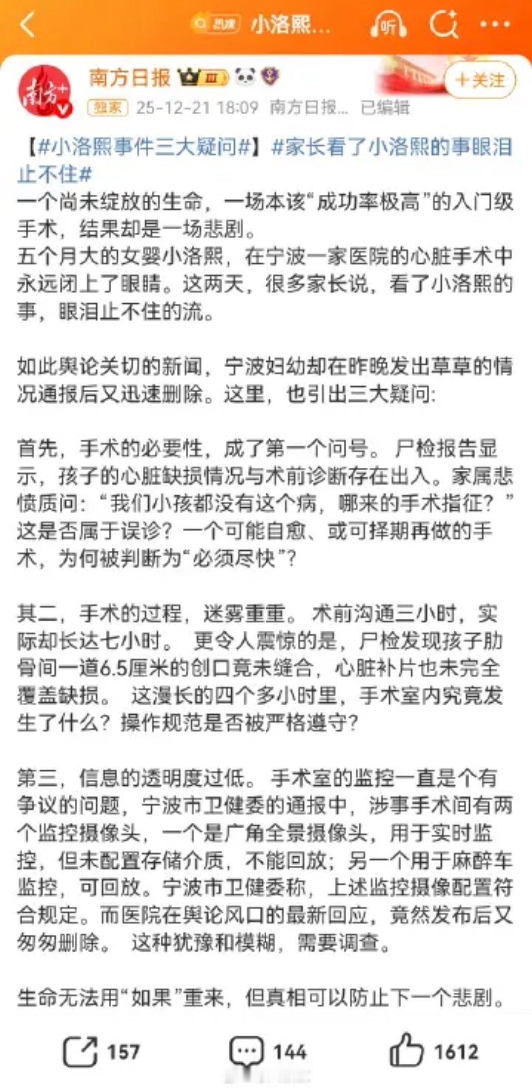 小洛熙事件调查惩前更要毖后我看今天上海瑞金医院的占世坤主任也对小洛熙主刀医生发出了五大疑问:-是否充分考虑到了手术时机的问题?-是不是可以等到2-3岁再手术?-是不是病情严重到立即进行手术?-手术前是否进行了多学科会诊?-非常疑难的(病情)是不是可以暂缓手术?这足以证明小洛熙事件在业界是引起了非常巨大的震动和关注。另外我查看了一下,上海瑞金医院不仅是三甲医院,更是一家著名的百年名院,在全国医院综合实力排名榜上曾多年名列前四,与北京协和、301等院同属超级医院。这件事情,至今为止,迷雾重重,透明度太低了,越发让人怀疑这里面有“鬼”。真的希望事件可以早日水落石出 广州