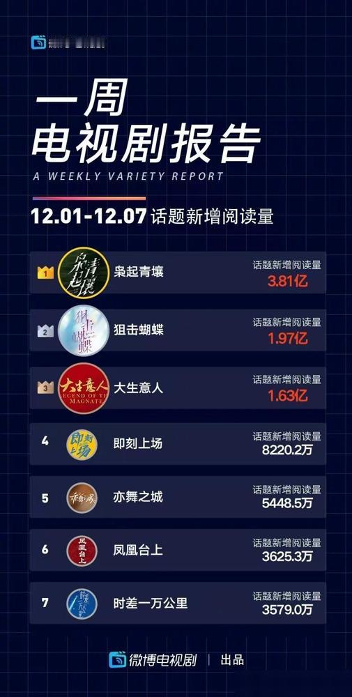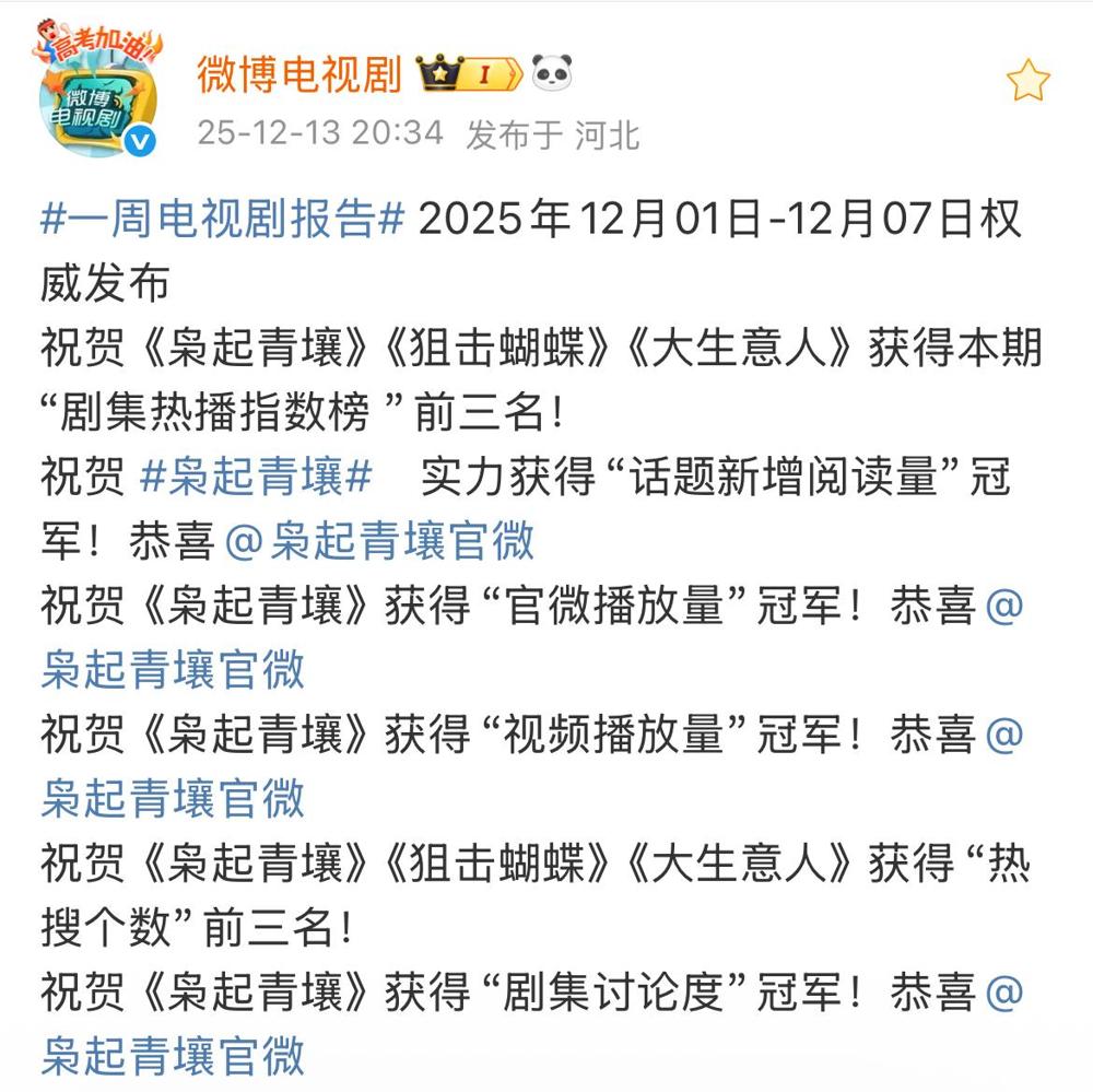 ❤️补充记录一个成绩,12月1日-7日的全端播放量榜单上,《枭起青壤》以1.7亿播放量、8.2%市占率位列第四,是榜单中唯一一部独播剧; 这一大串亮眼的数据其实是迪丽热巴最近两部作品《枭起青壤》和《利剑·玫瑰》的实绩汇总。随着各大平台发布年底盘点,这两部风格迥异的剧先后在权威榜单和官方认证里站稳了脚跟。 我挺在意那个“唯一独播”的标签。在全端播放量前几名里,其他剧大多是多平台分销,而《枭起青壤》只靠单一平台的流量就能冲到第四,说明剧本身的拉新能力和受众粘性确实很强。 再看微博那边的反馈,不管是热播指数还是讨论度几乎都是断层式的,这种“屠榜”状态大概就是剧集热度最直观的体现了。 说个容易被忽略的细节,《利剑·玫瑰》当年的开局其实并不算“豪华”,没有大厂光环也没有热门IP,只是个主打现实主义题材的A级分销剧。 但它硬是靠着打拐题材的深度,逆袭成了财报认证的S+爆款,还拿下了央八六年以来暑期普法剧收视的第二名。这种不靠CP营销、纯靠社会题材破圈的路径,对于流量演员来说真的很考验定力。 我感觉迪丽热巴现在的转型思路越来越稳了,从金鹅奖的优秀剧集认证到进入国家重点版权保护名单,她选戏的眼光开始向“硬核”靠拢。 这种无营销公司、纯靠作品说话的底气,可能就是演员在完成流量转型后,给市场交出的最硬的一份答卷。 说实话,比起虚无缥缈的人气,这种能写进财报、被官方反复点名的“双杀”实绩,才是艺人长期发展的真正护身符。