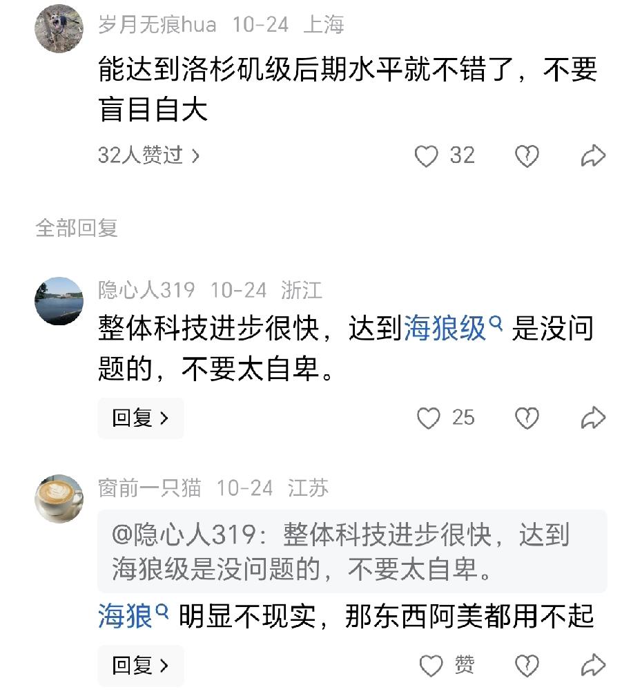 咱们的新型核潜艇能达到洛杉矶后期的水平就不错了,不要盲目自大。 我记得当年歼10刚出来的时候,那时候网络还不是很发达。 各种军事杂志都以歼10的评价也非常的保守,说歼10的水平能够达到美国F16早期型号的战斗力,就已经很不错了。 但是谁能想到歼10的战斗机现在不仅远远超过了F16的早期型号,而且能打败世界上号称最强四代半战斗机的阵风。