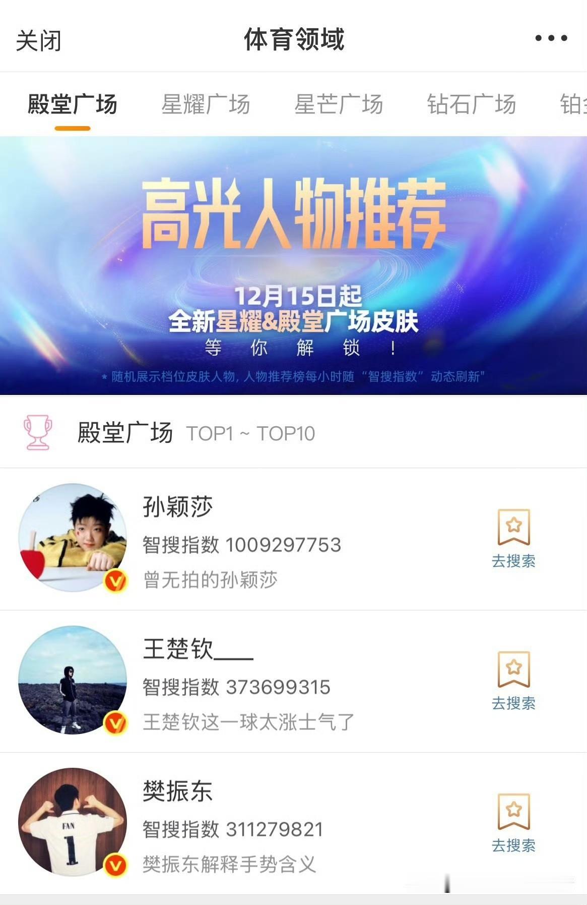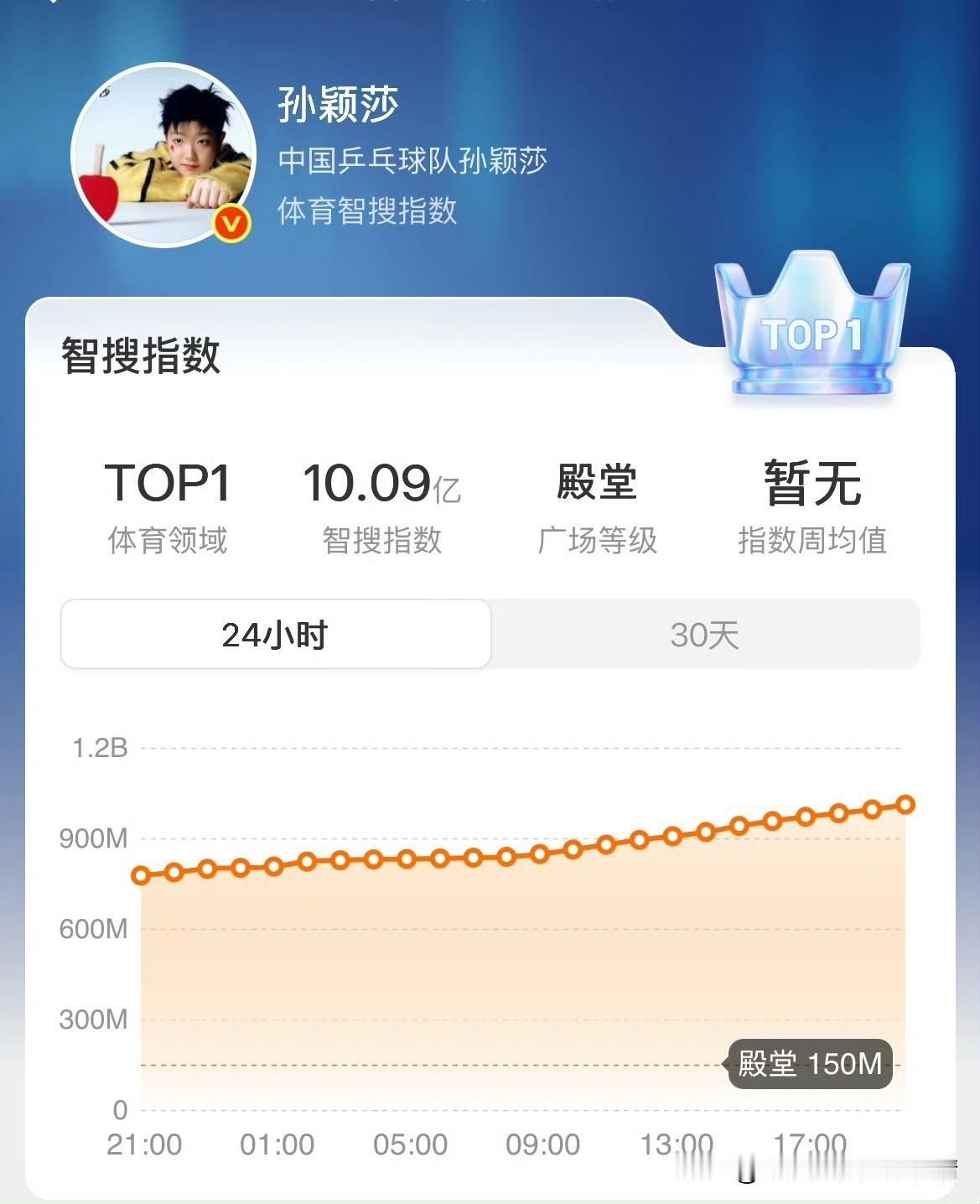 现今乒乓球女队谁最受欢迎? 孙颖莎再创微博数据新高度!其体育领域智搜指数突破10亿后持续攀升至12亿,稳坐殿堂广场TOP1宝座,远超同领域选手。超千万粉丝加持、2.4亿转评赞的热度,让“10亿女王”的称号实至名归,国乒小魔王的人气与实力双双登顶,尽显赛场外的超强号召力。