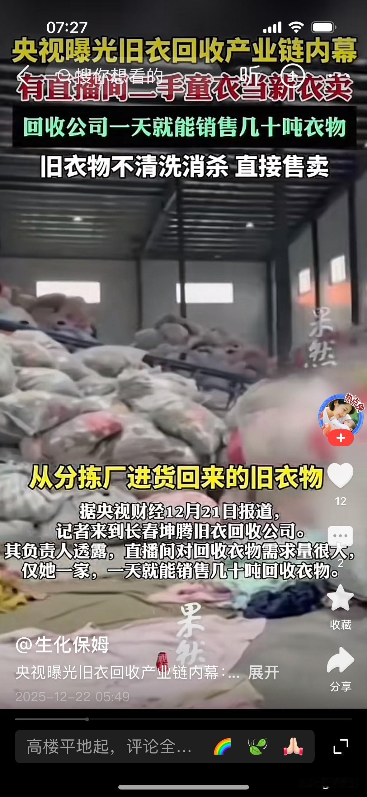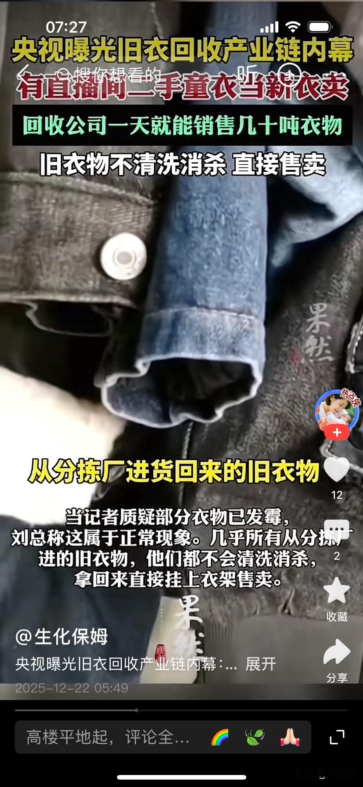 [微风][彩虹]你买的“大牌尾货”可能是别人穿过的!老北漂三十年,真心劝你一句:别拿身体赌便宜 我在北京待了快三十年,东城那片儿,闭着眼都能摸熟。 前二十多年,东四十条附近的小胡同,还有隆福寺、美术馆后街一带,挨着大马路的小门脸,一家接一家,全是卖“外贸尾货”“大牌孤品”的。 那些衣服,有的皱皱巴巴,有的看着还算板正,可标签不是模糊就是被剪得乱七八糟,跟商场里的新衣服比,总觉得哪儿不对劲。 这里面不少是从韩国倒腾回来的二手衣服,款式比当时国内的简洁、大方,看着也更洋气,质量有的确实还不错,所以那会儿很多上班族、白领都爱去淘,生意挺火。 我也爱逛,可我从来不买。 总觉得心里硌得慌,说不上来的不踏实,尤其是贴身的东西,我宁可多花点钱,买个心里干净。 今天刷到央视的报道,说现在不少直播间、小店打着“大牌尾货”“样衣”的旗号,其实是从旧衣回收箱、甚至垃圾站里收来的旧衣服,简单熨一下、换个吊牌就敢往外卖,有的领口有粉底印、裙摆有油渍,兜里还翻出别人的小票、纸巾,想想都起鸡皮疙瘩。 更要命的是,这些来源不明的旧衣,可能带着真菌、寄生虫,甚至有致癌物超标,长期穿在身上,皮肤、呼吸道都得跟着遭罪。 回头想想,当年在东四十条那些小门脸里淘货的人,现在想想,真有点后怕。 衣服这东西,贴身穿着,跟吃进嘴里的东西差不多,干净、放心,比什么大牌都重要。 买衣服的时候,我现在就记住三句话: 第一,看细节,标签乱剪、缝线粗糙、有怪味的,直接放下; 第二,看痕迹,领口、腋下、内侧有没有旧痕、油渍、粉底印; 第三,看渠道,来路不明的“尾货”“孤品”,再便宜也别碰。 与其一堆来路不明的“大牌”,不如少买两件,买自己信得过的。 人到五十,见多了,也看透了,钱是省出来的,命可不是。 穿衣这件小事,说白了,也是在给自己的生活把关。 记录我的2025